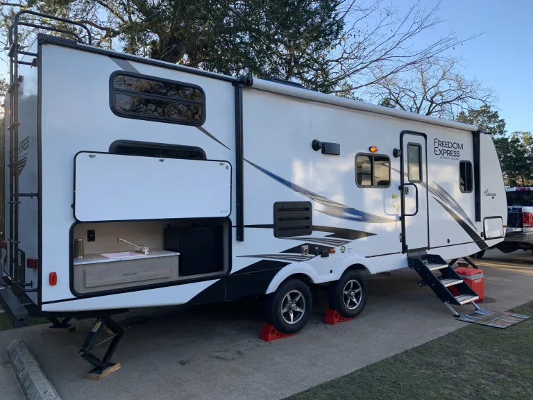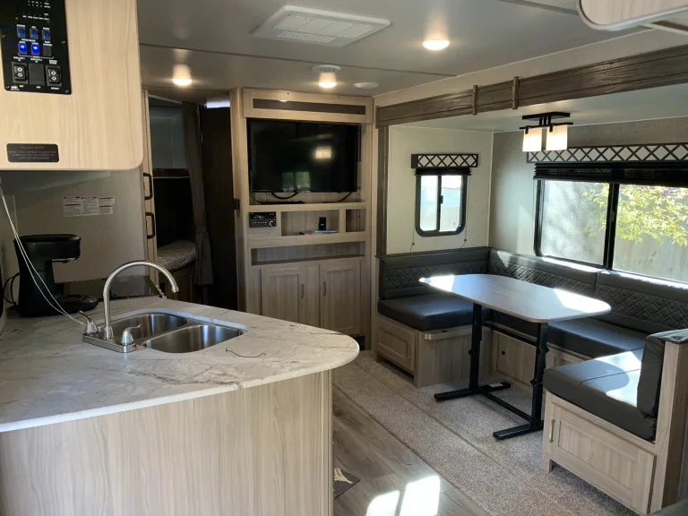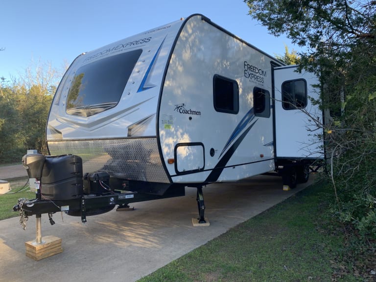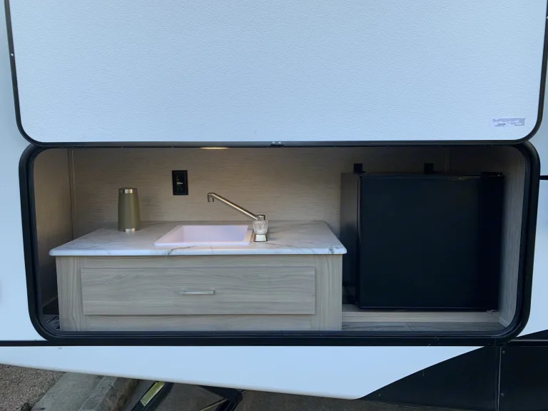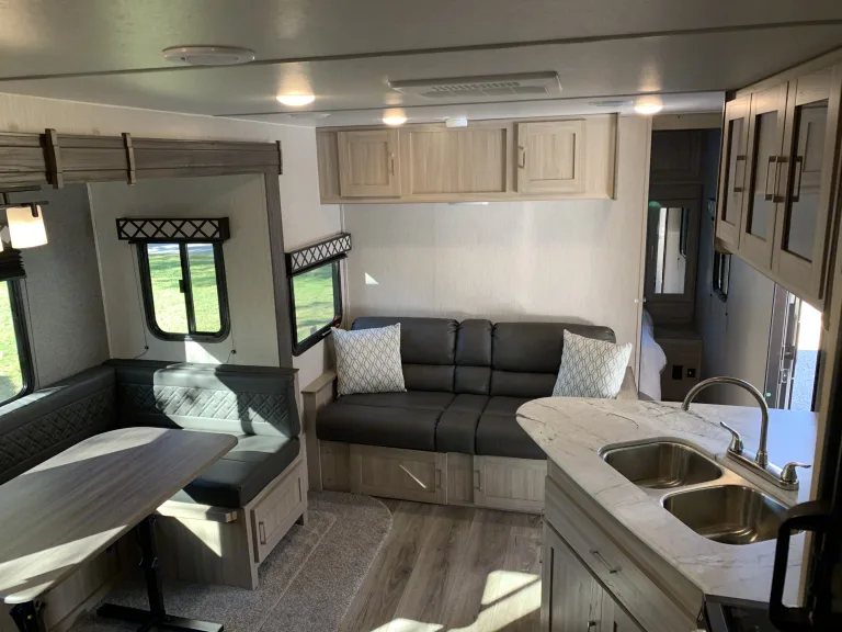 Start making memories today! The trailer comes equipped with queen sized bed in the master suite, a set of twin sized bunk beds and you can turn the sofa and dining table into beds. It has a single slide creating lots of living room space. The bathroom does have a small bathtub if you are traveling with little ones. The outside of the trailer has an awning with built in LED lighting and an outdoor kitchen to assist with all your cooking needs. We send out the trailer with all the camping essentials for the kitchen and basic camping needs.Our trailer is 31'9" and is 1/2 ton towable at 5581 base trailer weight and hitch weight of 715. It requires a 30 amp power service. Weight distribution hitch will be provided with the trailer.No pets please. No dry camping.