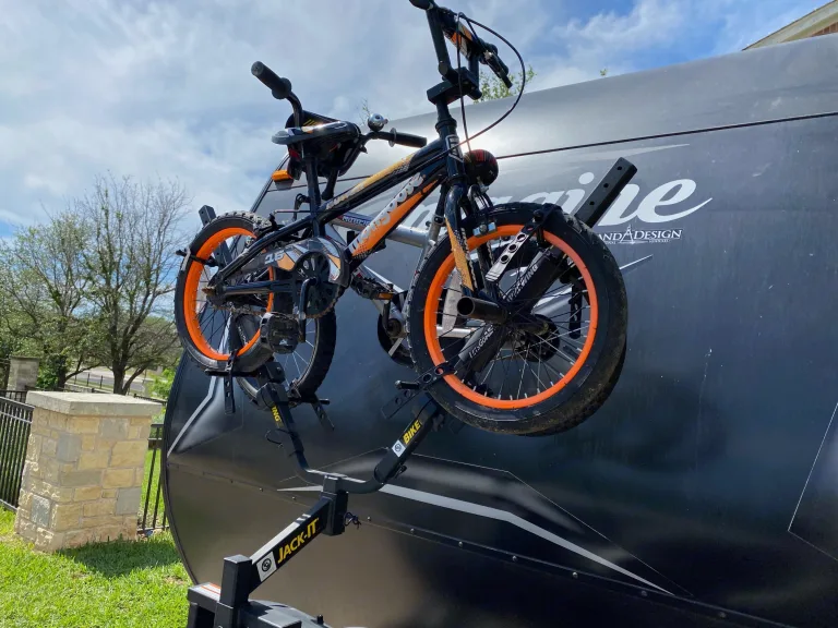 Yes, this unit has a back rack on the front that can carry two bikes while traveling. We can also include a lock to keep them safe.