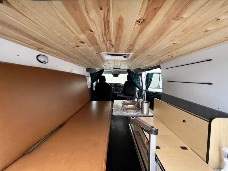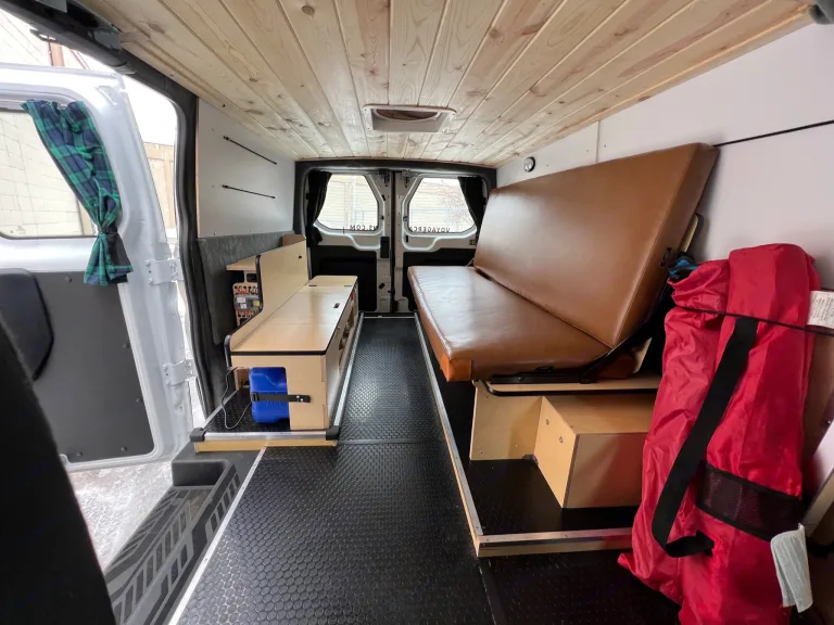 Our van includes a couch that turns into a larger, more comfortable bed, storage for your gear, a cooking area out of the back, solar-powered fridge, a sink, and a fan to help keep you cool. All of this in an easy to drive vehicle. You’ll never be more comfortable exploring the outdoors!
