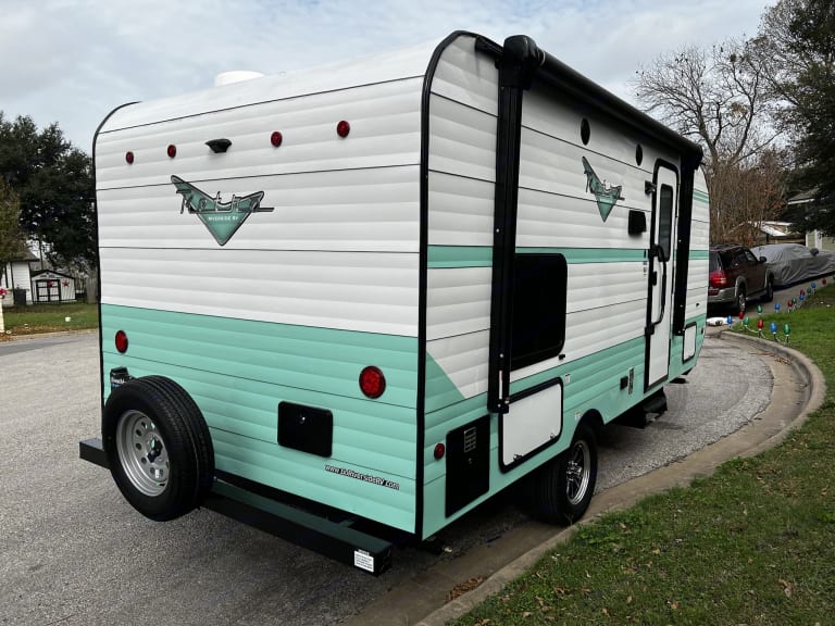 Fast forward to the past. Traveling never looked so good. Sleek lines and curves, colors that punch, and fantastic features- Get your vibe on! Make your trip as unforgettable with the Retro 179 which we call The Broken Spoke!This travel features a stylish retro interior taking you back to the 50's.. Offering a queen size bed, dinette table that turns into a twin bed, birch paneling, black and white checkered flooring, stove, double door refrigerator, TV, microwave, ample storage space, bathroom w/sink and much much more.
