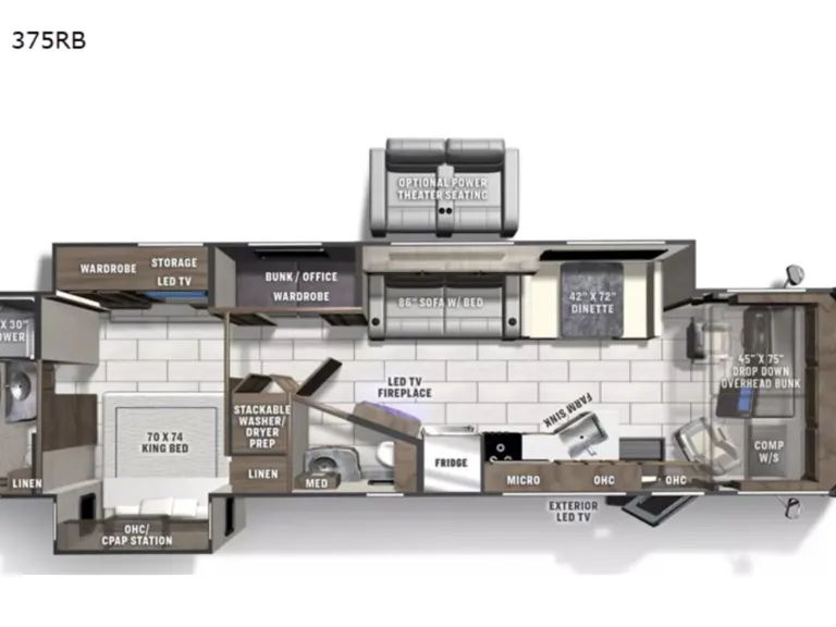 t's a clean decision to take this motorhome on your next vacation with a bath and a half! The full rear bathroom has a 38" x 30" shower and creates a master suite with the entrance going into the private bedroom which features a 70" x 74" king bed slide with Cpap station above it, a wardrobe, and a 32" LED TV with storage space. Just outside the bedroom is a prepped area to add an optional washer and dryer and a versatile space that can be transformed into bunks, an office, or a wardrobe area instead. The half bathroom is conveniently located close to the living/kitchen area for easy access for everyone. There is an 86" sofa with bed for extra sleeping space, but if you don't need the extra sleeping area then you can switch it out for the optional power theater seating. A 42" x 72" booth dinette could also transform into a sleeping space and the 47" x 81" drop down bunk over cab can be used for sleeping or storage! [Class-A 22.5]Each one of these Coachmen RV Encore Class A gas motorhomes have been engineered for maximum comfort! A Ford F53 chassis holds them together and a 7.3L V8 engine powers them to each destination. Both the crowned, laminated fiberglass roof and the high gloss gelcoat sidewalls come with Azdel superlite composite to prevent your unit from rotting away. Automatic leveling jacks make for an easy and quick set up when you arrive. You will appreciate having an exterior propane hookup and the pass-through full basement storage area has plenty of space for all of your outdoor gear, plus the radius trunk doors come with slam latch. With high definition back up and side cameras, you can travel with peace of mind. Come find your favorite one today!Options: