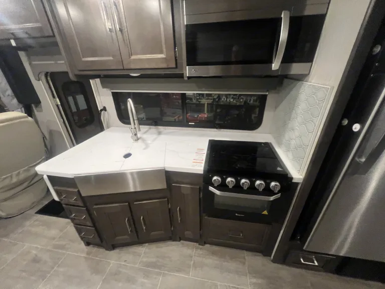 Kitchen is equipped with a farmhouse sink, three burner propane cooktop, oven, extra large microwave and a residential style refrigerator.
