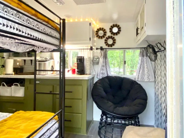 The main space features the kitchen area, a cozy reading nook and twin over twin bunk beds. The kitchen is equipped with a stainless steel camper size fridge/freezer combo, microwave, toaster, nugget ice maker, and Keurig single coffee maker. There is plenty of cabinet, shelf, and underbed storage in this area. Basic kitchen utensils are provided as well as basic cleaning supplies and some small appliances.