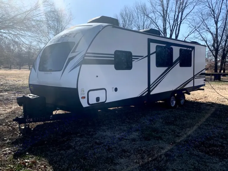 Outside camp kitchen, power tongue jack, King size bed with upgraded mattress, solid countertops, kitchen island with large sink. When you rent this RV and stay on site at our RV park you can rent this RV for only $100/night.