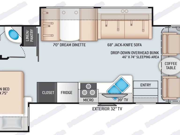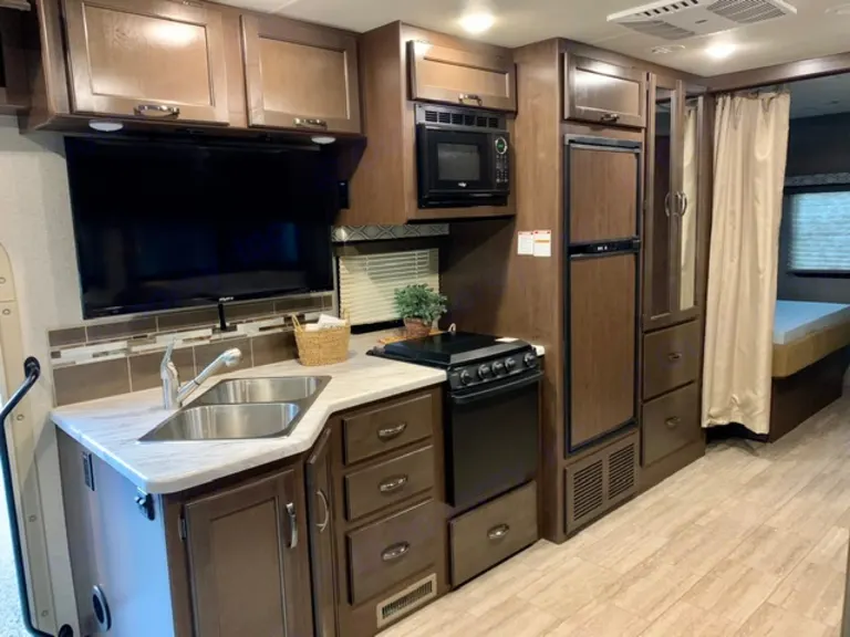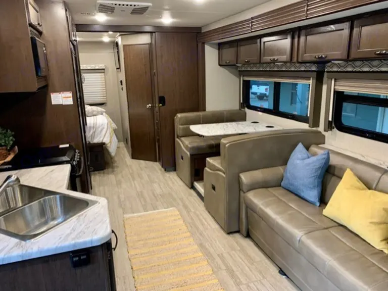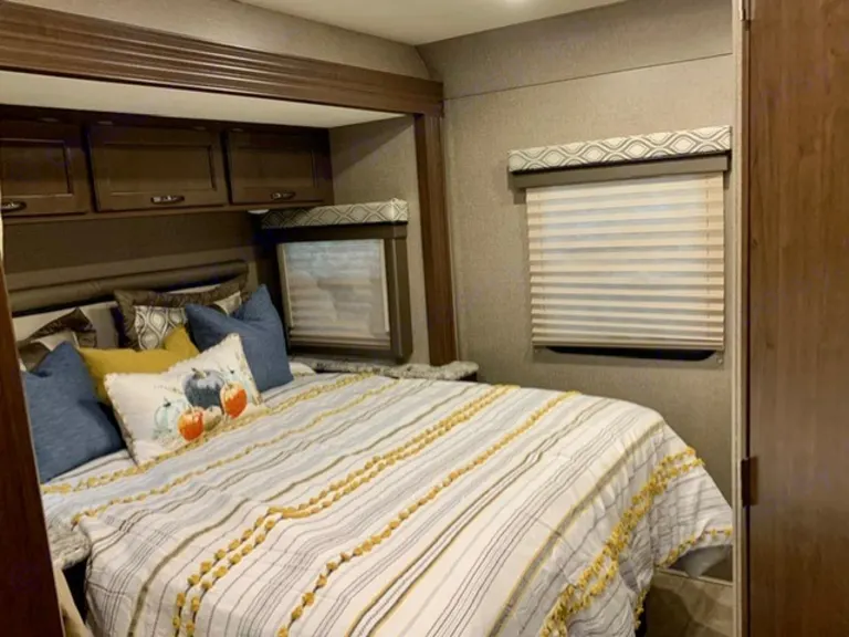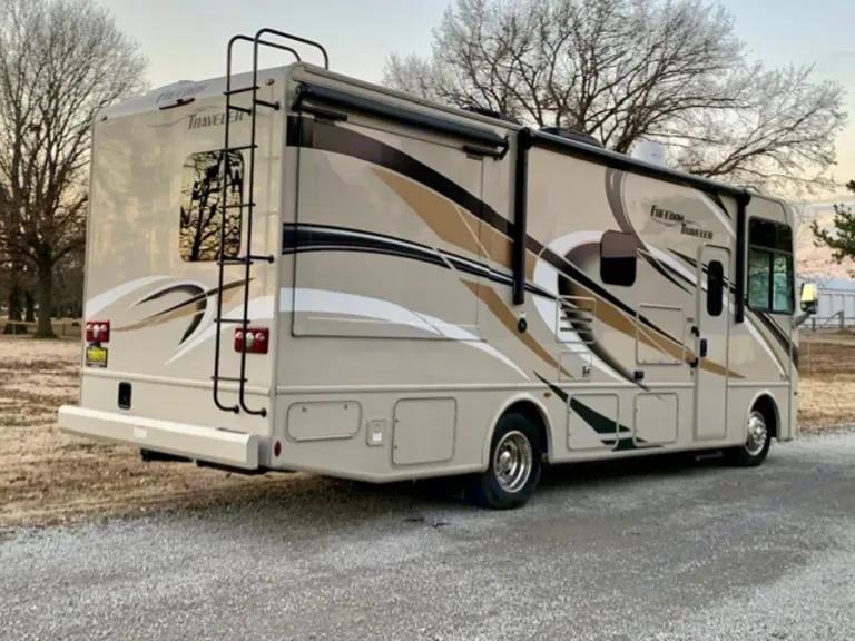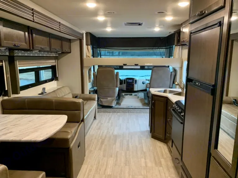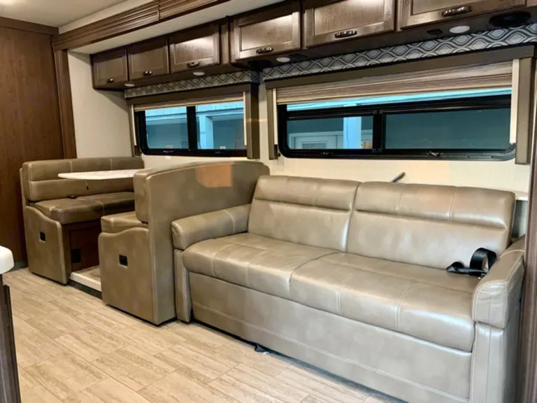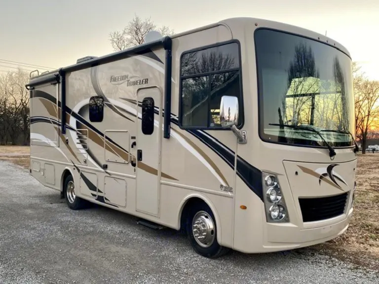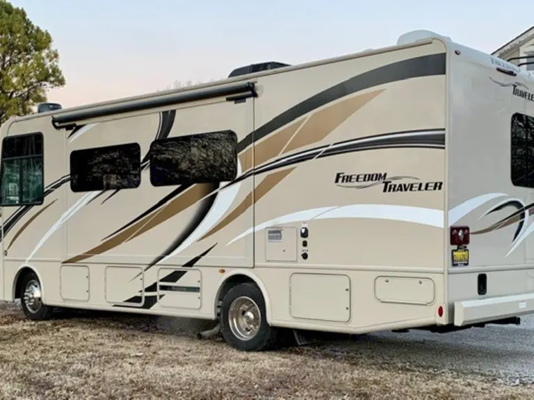 This class A motorhome will make your next adventure a comfortable one. This beautiful motorhome has plenty of room for sleeping with a queen bed in back, couch converts to bed as well as the dining table and don't a surprise power drop down overhead bunk that the kids will love. Automatic leveling jacks with the push of a button make setting up this motorhome a breeze. The front seats rotate to a removable coffee table allowing for extra seating. The satellite service allows you to not miss out on football games while on the road. The outdoor television provides a space to entertain outdoors. There is a ton of storage inside and out as well. When you rent this RV and stay on site at our RV park you can rent this RV for only $200/night.