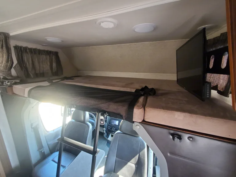 2 adults sit in buckets seats in front can and 2 adults can comfortably sleep above the cab.