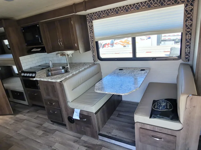 The table in the bunk area folds down to sleep 2 adults