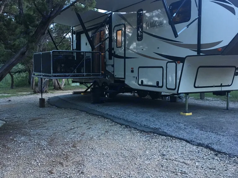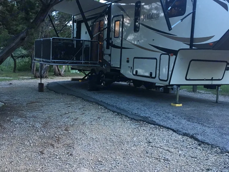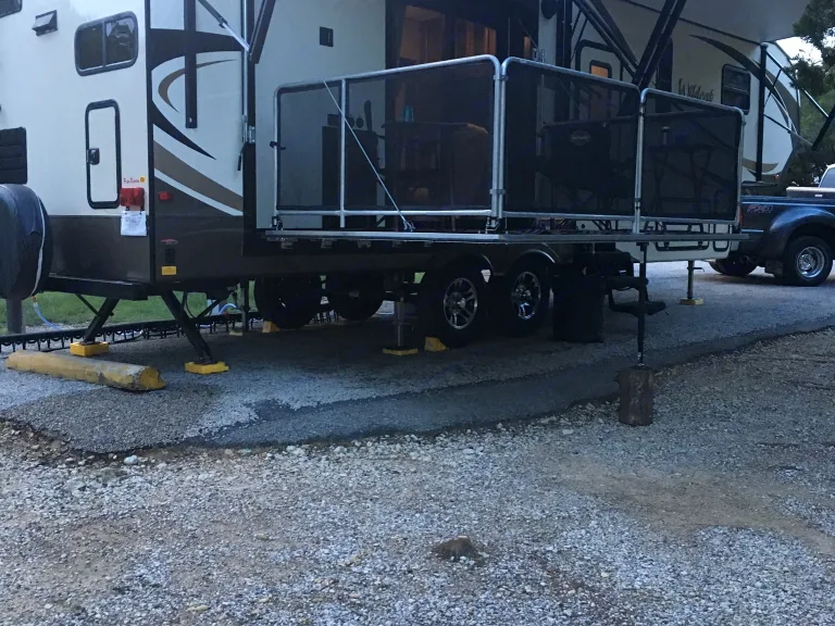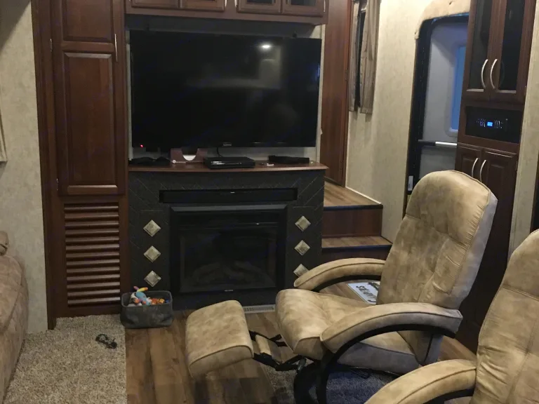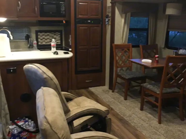 32ft fifth wheel rear kitchen sleeps 4 has a side patio out side frig on the patio. Its a great camper is very open in side has a sliding glass door to the patio makes it bigger then it is. You can enjoy the out doors with out having to sit out on the ground with all the bugs. Full bath large shower. 50amp hookup 30000btu heater. We also furnish you with bedding,towels,cooking utensils pots and pans skillet and a folding gas grill to use. I will also be willing to haul the trailer to a location set it up and then pick it up.