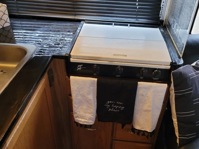 We purchased our RV from the original owner who took wonderful care of it. We remodeled it to bring it into the 21st century. We love the layout of this RV, it is super comfortable and roomy.The master bedroom has a brand new queen mattress from Costco that is very comfortable. The bathroom door opens to make the rear of the RV into a master bedroom with a bathroom and shower. There is tons of storage as well.The main cabin has all the amenities needed, range, microwave, toaster oven. Next to that is a roomy kitchen table and full size jackknife couch. There is also a queen bed over the cab that is very comfortable. It has a brand new memory foam topper as well. There is an on-board remote start generator to power all of these amenities while traveling down the road. Also included is the use of a 4 position bike rack/cargo carrier.What's includedBasic kitchen utensils, a couple pots and pans, coffee maker and filters, dish soap.