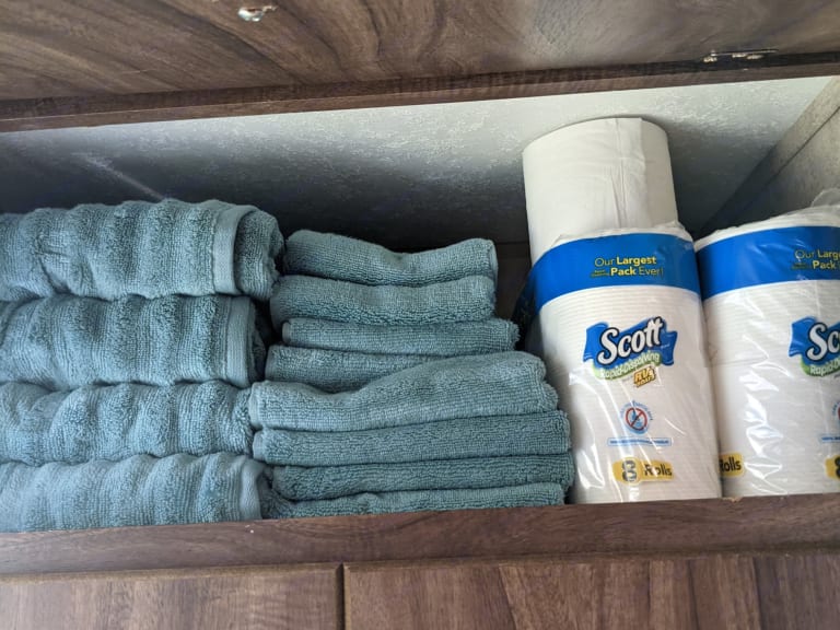 Kitchen and bathroom towels as well as bedding for the full size bed as well as the single dinette conversion
