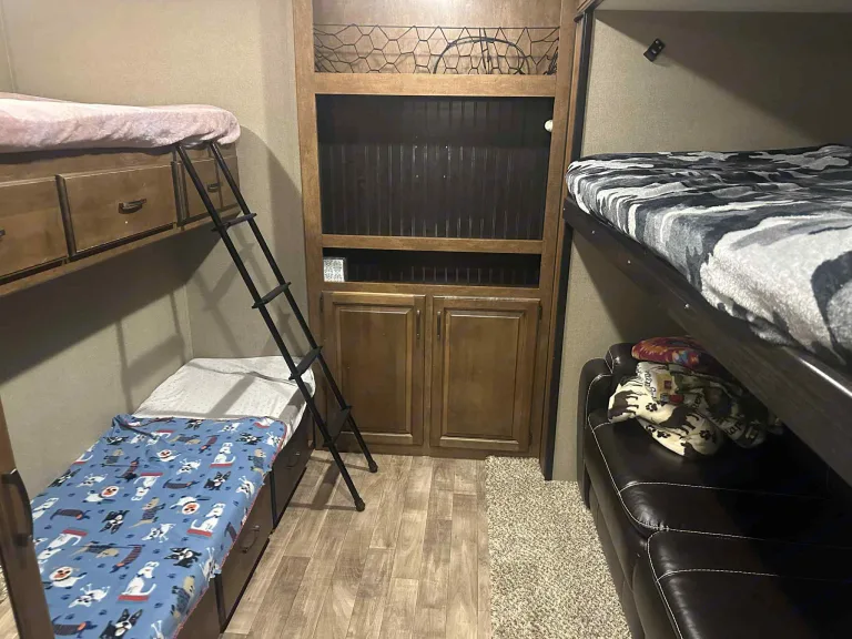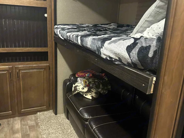 It has one Queen Bed, three singles in the bunk room along with a pull out couch in the bunk room and a dinette in the dining room the folds down into a bed. It could sleep 8 comfortably.We will provide all linens and kitchen supplies for tailgating - you just need your food!What's included• If you are in the ORV Lot - we can provide a Generator for an extra Charge of $200 for the weekend.