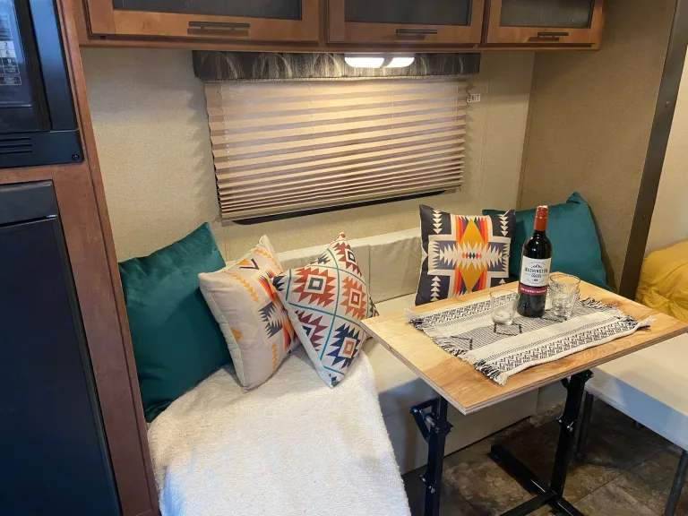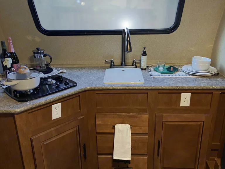 Sun Chaser is a fun little home away from home. It has all the essential creature comforts for the perfect camping trip!Vehicles must have a tow max capacity of at least 3000 lbs. to safely and easily tow Sun Chaser. Look at your owners manual or call a dealership to verify your vehicle is able to tow this amount. A 2" hitch is available. Electrical is a 7 prong connection. Adapter is not provided. Please verify your vehicles capabilities before requesting to book.What's includedSun Chaser includes the essentials. Propane heater, AC with an additional electric heater for those really chilly days. Kitchen includes a stove, convection microwave and refrigerator. *Please note that the AC and convection microwave work when hooked up only.Lots of storage for your goodies. Bathroom with shower. Queen bed and slide out dinette with double sleeper sofa. Comfortable for three adults or two adults and two smaller humans. 19" TV and DVD/CD player, bluetooth radio with indoor and outdoor speakers. Fresh linens for both beds, fresh towels for indoor shower use only, shampoo/conditioner/shower gel, full cookware and dining utensils, storage baskets for your food items, essential spices, knives, cutting board, strainer, french press, kettle, cleaning supplies, paper towels, bathroom tissue, hand sanitizer, 2 camping chairs in exterior storage. Other things to noteThings you should bring: