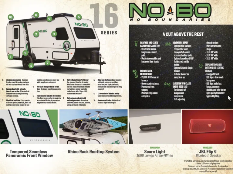 No Boundaries, with industry leading ground-clearance, larger diameter tires will allow you to explore and set up camp in places that would otherwise be inaccessible. Additionally, the upscale interior focuses on thoughtful, useful design with ample storage and a bright and refreshing living space.