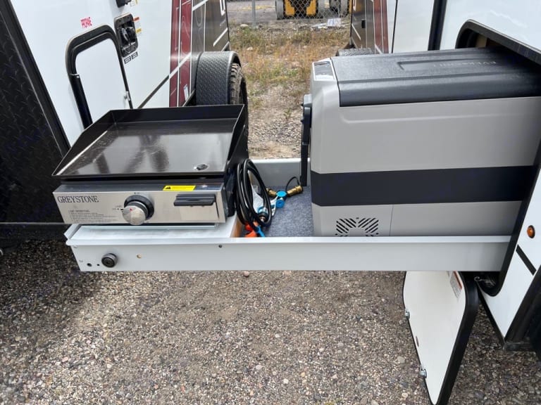 Outdoor Living: Extend your living space with the 270 degree manual awning. Set up camp chairs, enjoy a meal, and soak in the views. The exterior kitchen features a refrigerator and stove—perfect for whipping up campfire meals.