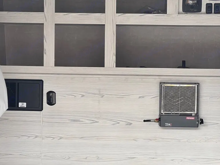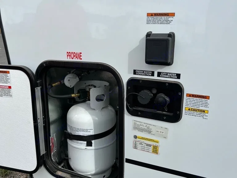 Comfortable Interior: Inside, you’ll find a cozy ~full-size bed and a convertible queen size sofa bed. The vinyl flooring is easy to clean, and the wallpaper adds a touch of homey charm. Plus, the automatic air conditioning keeps you cool during hot summer days and a propane heater to take the bite out of those cold mornings.