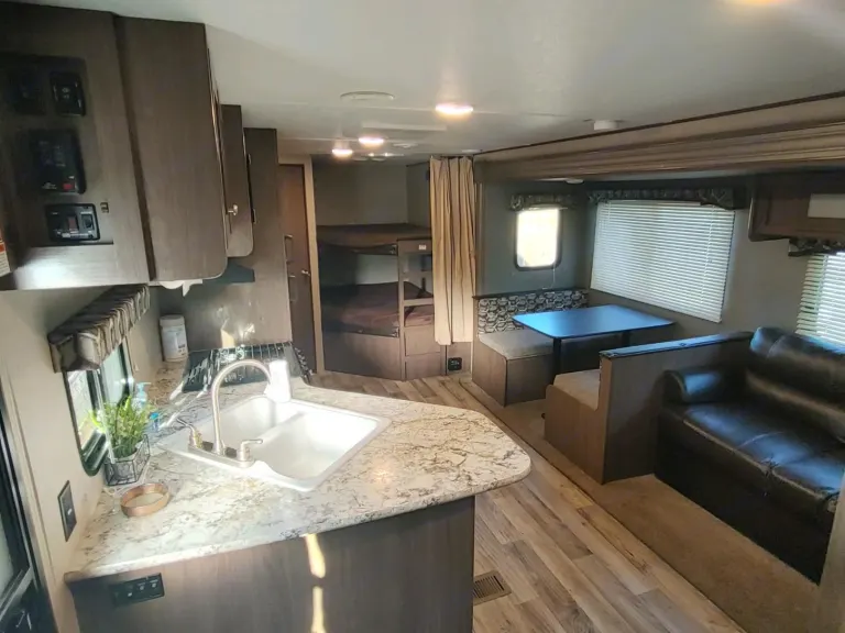 Beautiful bunkhouse trailer available for rent for your camping pleasure! Featuring two large bunks, convertible sofa and dinette, and queen master bed. Comes equipped with most of the necessary items needed for a quick getaway from normal life (ie cups, plates, silverware, pots and pans, etc). Grab some food and your loved ones and be on your way to enjoying the peace of nature. Delivery to your home or campsite is available. Only $135/night! Two night minimum is required. Weight for towing dry is 5720 and 7500 fully loaded. Located in southern Bend Oregon. What's includedSilverware