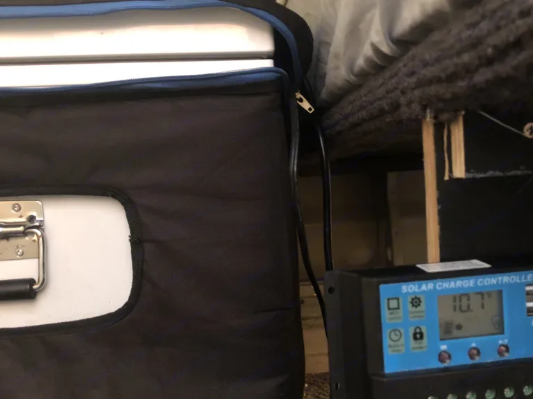 The solar panel charges the fridge and any devices plugged into the secondary battery.