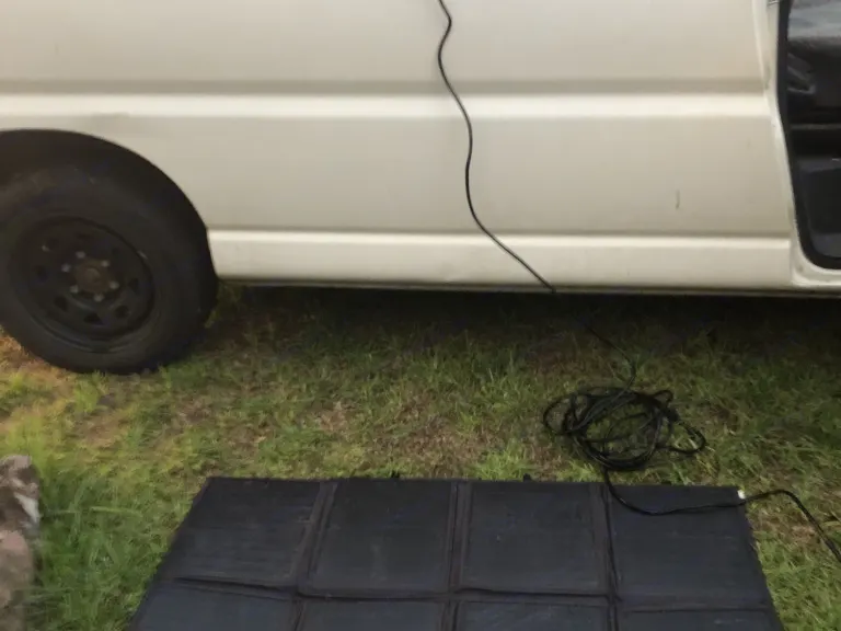 Compact fold out solar panel blanket that plugs into the secondary battery with a 10m long 12v power lead.