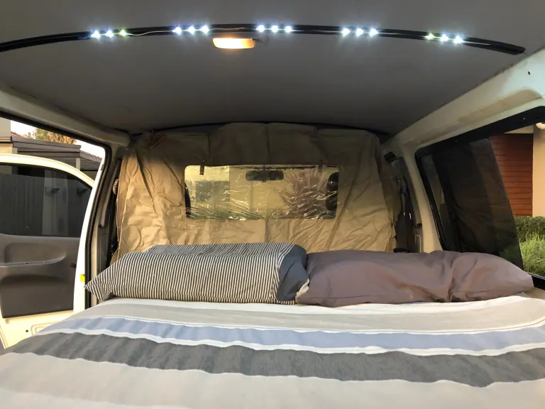 Roll down privacy screen between the driving cabin and bed.