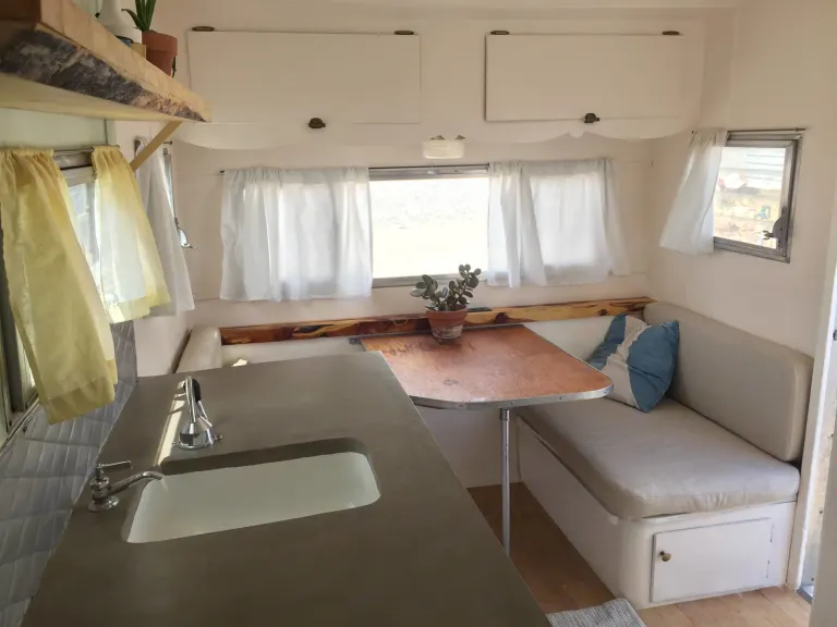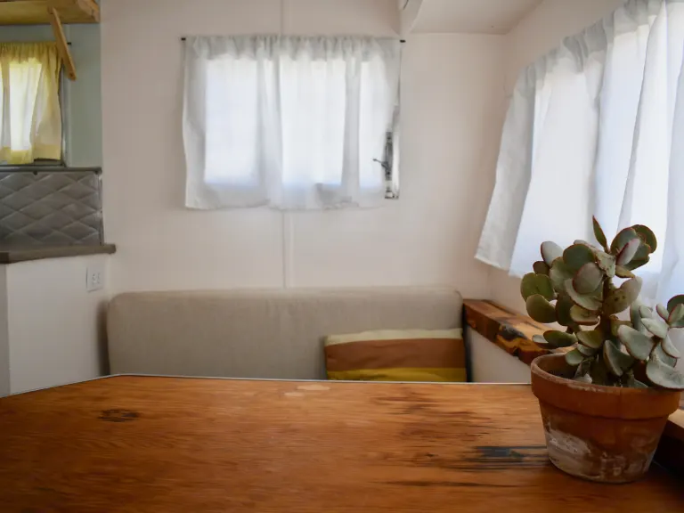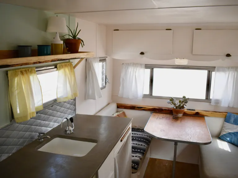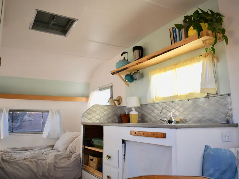 Experience the high desert in vintage charm. This little camper has been remodeled and streamlined for a minimalist and vintage experience. The 1960 Aljo Skyline sleeps 2 in a double bed with fresh linens, small kitchen with sink and a propane burner, along with cooking utensils and cookware, cutlery, plates and cups. We provide locally roasted coffee for two. A first aid kit is stocked for small accidents. The 10 gallon fresh water tank is filled. (We offer a refill for extended stays).