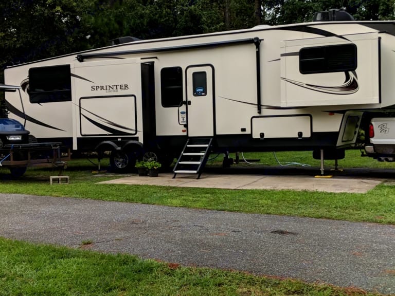Very spacious for a couple or small family. 4 slide outs. Indoor/outdoor entertainment center. Full size refrigerator. Full size kitchen inside with outdoor kitchen and mini fridge. Plenty of storage. Washer and dryer. RV king sized bed with tri-fold couch and two recliners. If you need another bed there's plenty of room for an Aero Bed in the living room. Lots of windows and cold A/C. Auto leveling.