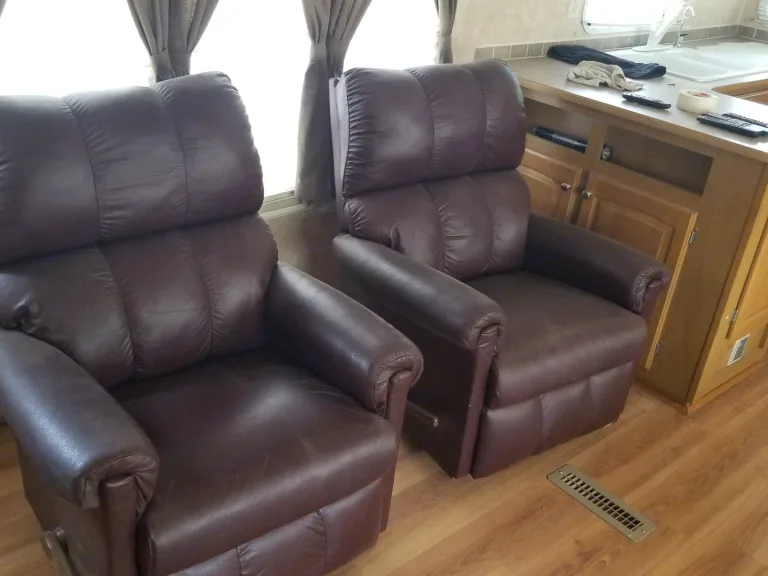 The RVs master bedroom has a queen sized bed and living room has a fold out coach.