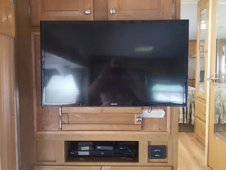 The entertainment center is equipped with a 32 inch flat screen TV. surround sound speakers throughout and a CD player with selection of movies. The digital amp has all the power you would need. As well as being satalite radio ready.