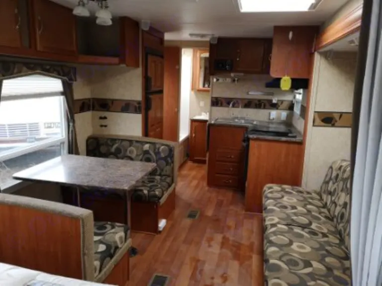 Be comfortable while you're camping with this luxury 23ft camper trailer fully equipped with a stove, double sized bed, slide out bed, and a convertible bed. The trailer sleeps 6 people comfortably and is tow able without an equalizer hitch. Delivery is available for an additional fee.