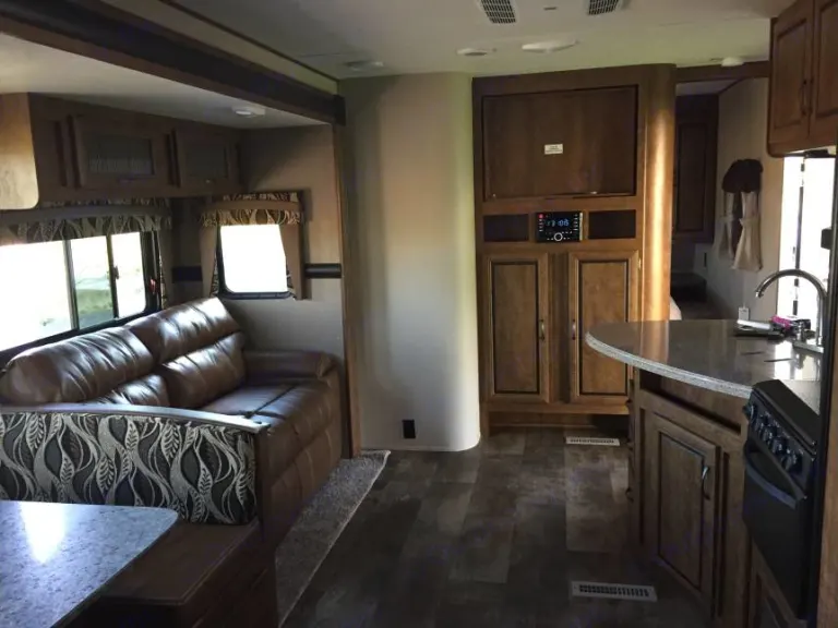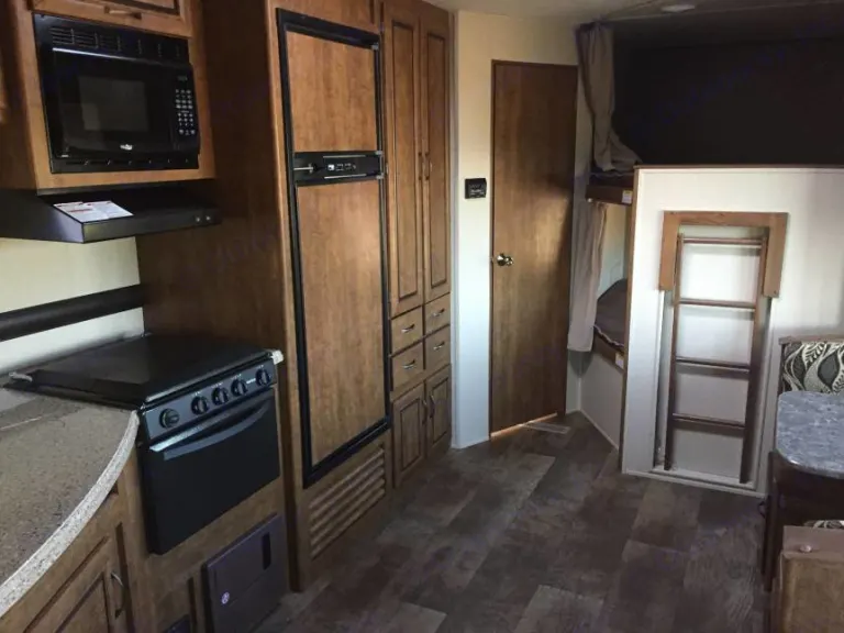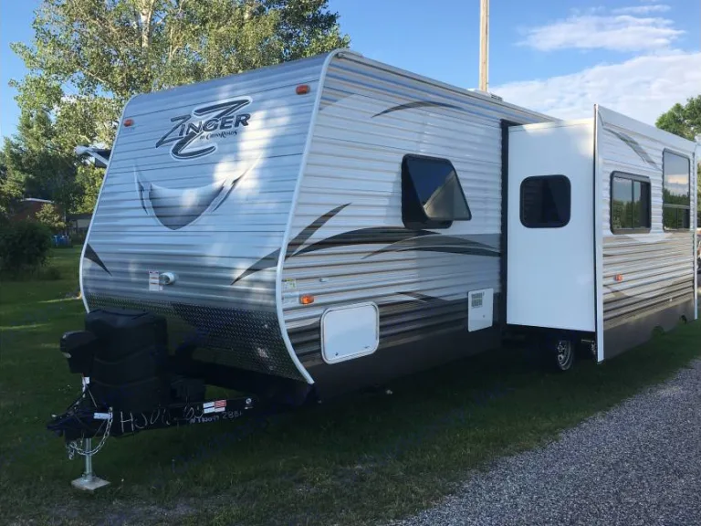 2017 Zinger 28' travel trailer. One Slide-out (Living Room). Queen Bed, 2-Bunk bed, 2 fold out beds.~`This is a PET Free / Smoke-Free Camper`~Flat screen tv with surround sound dvd player which can be turned around to either the front or master bedroom, it also has speakers outside so you can enjoy music/radio while lounging around the campsite.***- Brand new Queen Matress and Solar added for 2021! -***The master bed and couch make into full size comfy queen beds and the table and bunks are comfortable doubles. The slideout adds a ton of room to move around. That combined with a good amount of counter space and kitchen amenities make fixing meals easy even if it's raining outside and everyone's inside playing games. The power awning easily increases comfortable living space outside, rain or shine.Flying in / don't have a vehicle?