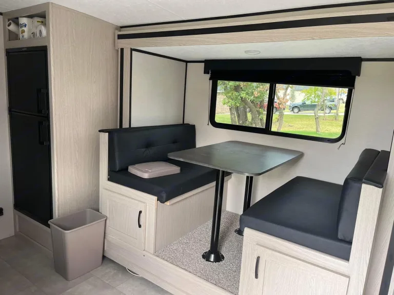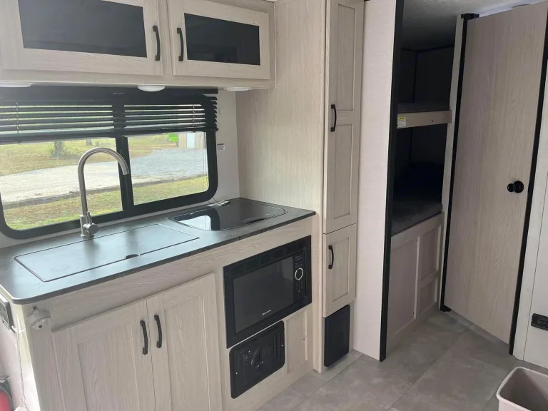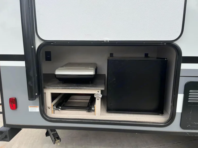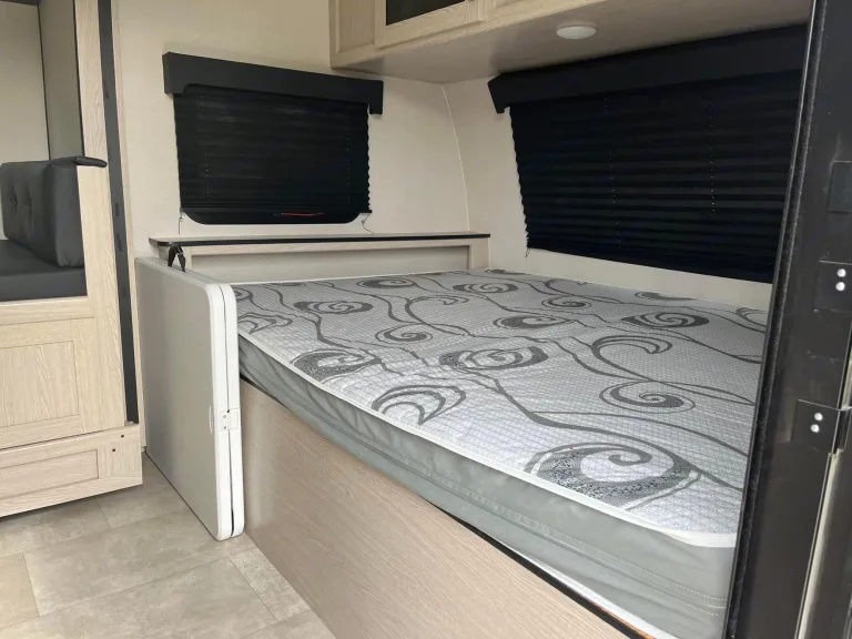 Light weight (3400lbs)so almost anything can tow it. Off grid package keeps battery charged when camping off grid. Small fridge located in the outside entertainment along with gas grill. Outdoor speakers. Heat and AC work great. 2 twin size bunks, not made for adults. Queen bed for adults. Awning keeps you cool from the heat. Twin 20lb propane tanks keep you going. 30 amp service. Some dishes and cookware included.What's includedSome dishes and cookware included.Other things to noteNo smoking and no pets!