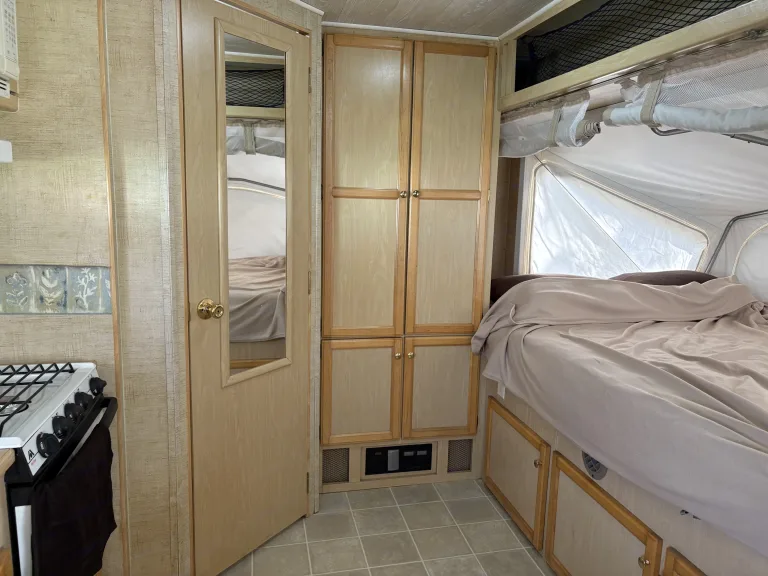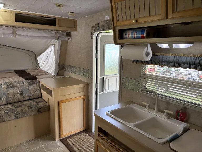 Featuring 2 queen beds and a table that can fold down into a twin sized bed, this camper comfortably sleeps 4 grown adults and another adult or 2 children on the table bed.The kitchen has ample counter space, a spacious fridge/freezer, microwave, 3 burner range/oven, and a large double sink. The kitchen comes stocked with dishes, cups, utensils and silverware. The bathroom has plenty of room as well.What all is included for your trip?