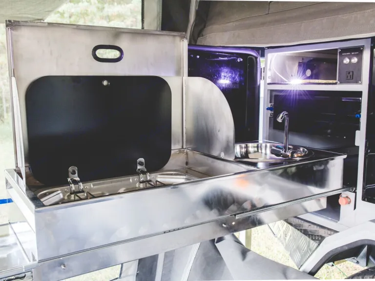 The Crux Expedition Trailer 1600 is an off-road, off-grid beast. It is lightweight, durable, and provides water, power, 2 burner stove, Euro queen bed, with weatherproof space for an additional 8 people. check it out at