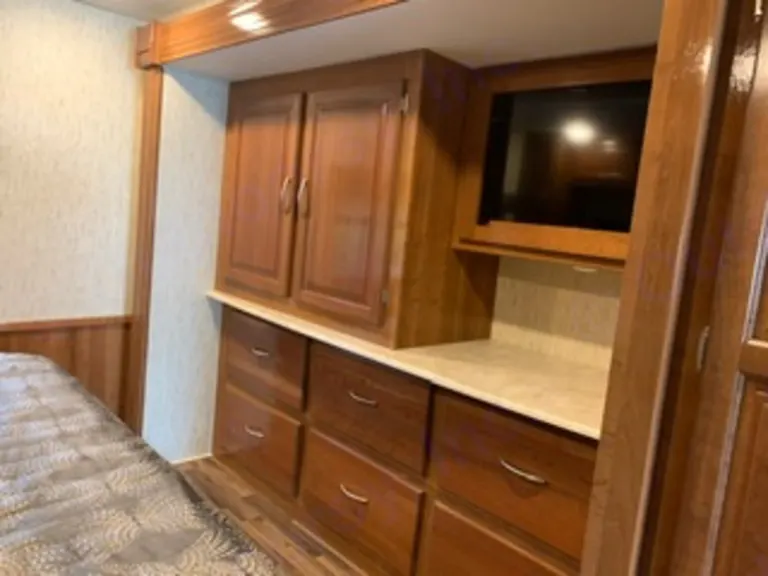 I slide out on drivers side. Like new, beautiful and clean interiors. Full kitchen includes microwave, 3 stove top burners, double sink, great size residential refrigerator, and spacious pantry. Dual A/C. For your entertainment I include 3 42’’ TV’s with dvd players and fireplace. Beautiful pull out couch converts into King size bed, full size bunk bed above driver area, and a dinette conversion. Bathroom is spacious with a walk in shower and sink. The Master bedroom has a king size bed , 32" TV, dvd player, and so much storage under bed and cabinets. A lot of storage cabinets throughout entire RV and a large storage space underneath. Enjoy dining with the outdoor kitchen. Includes a small area to prepare foods and sink, and a hook up for bbq grill included. 42" outdoor TV, dvd player, and 2 retractable electric awnings.What's includedKitchen comes with everything you need to cook your meals and includes Dishes, Utensils, Cups and glasses.