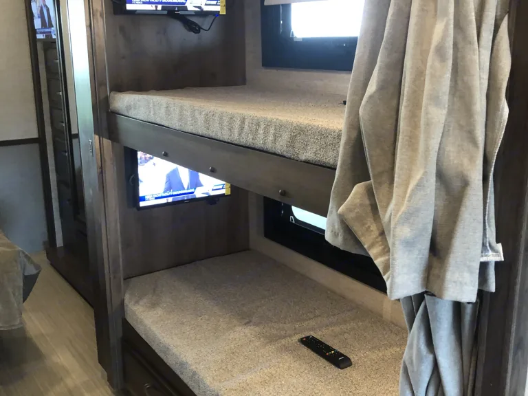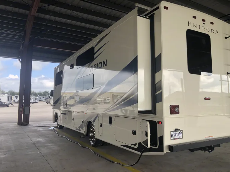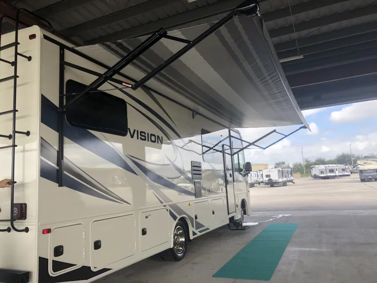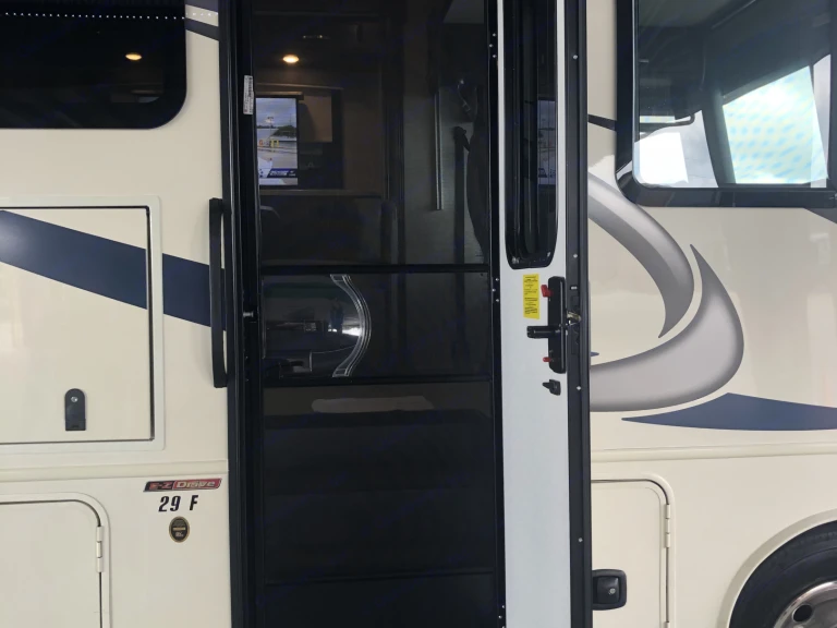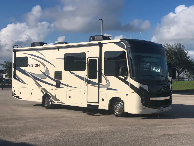 Start the perfect travel adventure in the comfort of this brand new coach. It's a perfect size for your family to safely enjoy the trip of a lifetime. This Vision coach comes equipped with Entegra's EZ-Drive system allowing for a much easier and safer drive for a Class A Motorhome. This coach drives as easy as a class C if not easier with all the cameras. It features a queen bed in the master bedroom with privacy door and double entry bathroom. The kids will love having bunk beds (with TV’s) to sleep on, and you might like to add the drop down overhead bunk option for more sleeping space for friends.When you get to your destination, easily set up the 23' electric awning and large full-wall slide out to start your adventure. You can go hiking or stay around the campsite to make a warm meal using the residential-size microwave or Furrion all-in-one cooktop and oven. The booth dinette and sofa allow you to eat inside as well as the swivel driver and passenger seats with cockpit table. You will find food storage in the double door refrigerator and the pantry, and clothing storage within the bedroom wardrobe and dresser.Brand New !!!!This coach features 5 TVs, Outdoor TV/DVD/CD player, bluetooth radio/phone capabilities, auto leveling system, outdoor shower, and plenty of storage space.2 A/C units and Heat availableThis well equipped coach comes equipped with pots/pans, silverware, plates/bowls, toaster, keurig coffee system and more.What's includedStocked kitchen