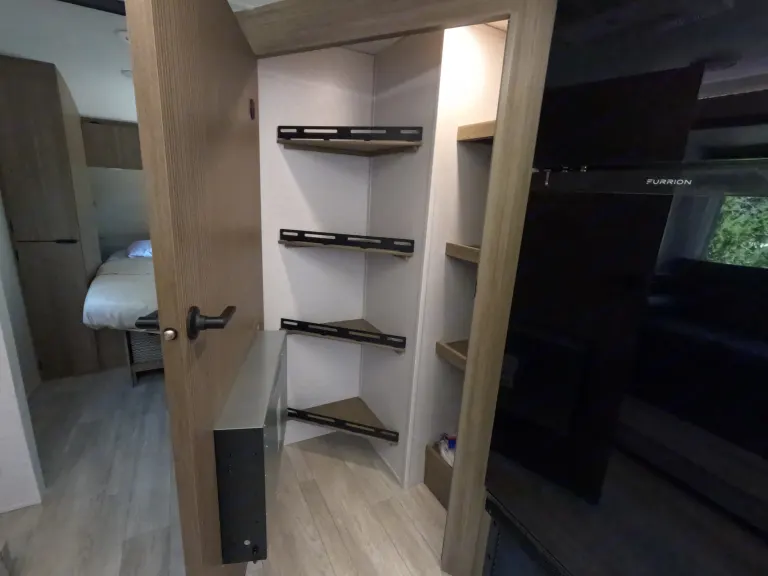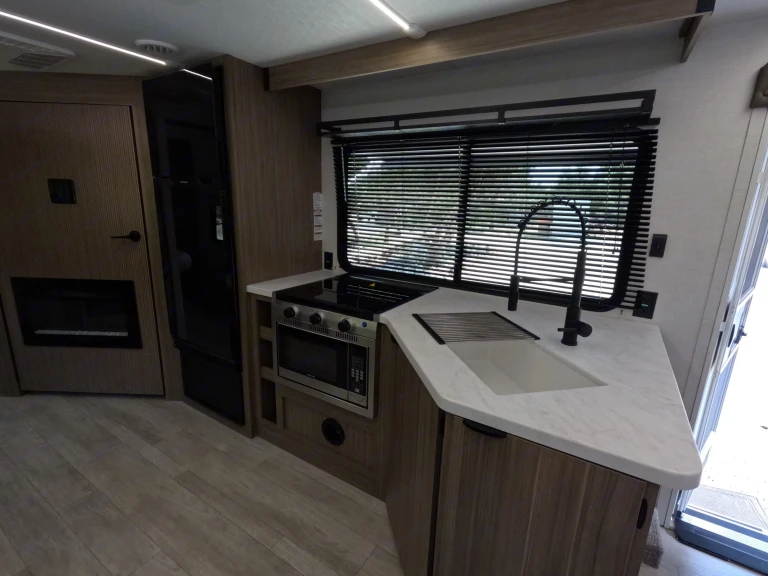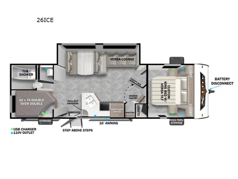 You're sure to make camping memories in this spacious travel trailer! You can easily sleep eight people each night thanks to the double-size bunks, the custom king bed with Versa Tilt in the front bedroom plus the Versa-Lounge within the large slide out! The three burner cooktop and microwave oven will let you make meals each day, and you'll appreciate the hidden pantry with shelves behind the fireplace. There is also a booth dinette where you can dine together or play a game of cards after dinner is cleaned up, or you may just find yourselves outdoors under the 16' power awning with LED lights. And don't overlook the full bath, complete with a tub/shower that will make bath time easier if you have little ones.