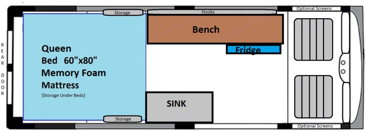 Experience the perfect fusion of outdoor adventuring and luxurious living with our Wandervan campervan—the next evolution of camping. Our seamless self-serve pickup and smart-lock system will have you hitting the road in no time.Embrace the coziness of our Small-sized campervan crafted just for two, plus small kids. Rest well in our ultra-comfortable queen-sized bed, outfitted with a superior 6" memory foam mattress and pre-prepared with a fresh fitted sheet as a part of our commitment to your convenience. We can add a Luno mattress system to create another sleeping area in the front cab area. This is an inflatable mattress system, so families with 1 or 2 kids can easily make this size of van work. We can also add a second row of seating for kids.Designed to deliver an accessible interior environment. If you need more headroom, check out our other van listings, or visit our website to learn more. Your gear will be easily accessible and perfectly organized under the bed with approximately 13 inches of clearance.Designed with safety and comfort in mind, the leathery seating provides secure belt-fastening for two travelers. To accommodate your party, add an extra 2-person bench with seatbelts upon request. Cook up your camping cuisines in our fully-equipped kitchen boasting a 31-quart refrigerator, a manual pump sink for water access, spacious countertops, a dedicated kitchen cabinet, a deployable kitchen table, and a robust 2-burner Coleman stove (note: 16 oz propane fuel canister not included).Settle back into our camping chairs—provided for each vanner—to soak up panoramas, star gaze or just enjoy a good old-fashioned chat. Sit comfortably inside the van on the plush bench, an ideal perch to prepare for your day’s expeditions.At Wandervans, we celebrate the thrill of open-air living without compromising on your comfort. Our campervan features intuitive magnetic mosquito nets for an easy-in, easy-out experience, ensuring you can bask in the ambiance while keeping the bugs at bay.With ample hooks and extensive storage space, you'll enjoy the convenience of having your personal items tucked neatly away yet always within arm's reach. While designed for backcountry adventures, this vehicle includes a hitch receiver but excludes trailer lights connections to keep the focus on self-sufficient camping.Travel in style and efficiency; this campervan promises an impressive 20 mpg on the highways, making your trips more cost-effective and eco-friendly. Each trip is available with an inclusive 125 miles per day. Need a little more? We also offer custom mileage packages that allow you to pre-pay for your mileage overage for $0.30 cents/mile as opposed to the standard $0.35 cents/mile perfect for longer journeys or in-depth explorations.Set off with peace of mind! For more information on our comprehensive insurance coverage, visit our website at .Promising exceptional service and an unforgettable campervan experience, we are excited to help you fulfill your adventure bucket list in comfort and style. Let the open