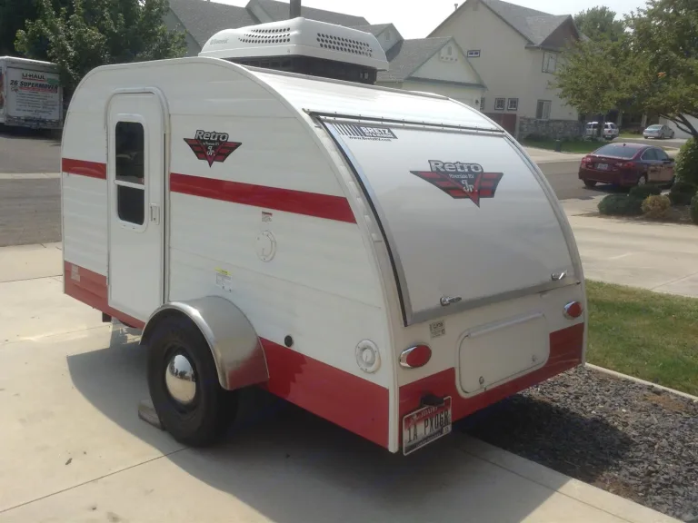 Sleeping for 2 with a little storage and an outside kitchen with a gas cook top and sink. On board fresh water tank with pump and air conditioner.Teardrop camper; Queen size bed, Air conditioner, heater; USB charging ports; TV/DVD under cabinet installed; cabinet storage inside and out, plus storage area under kitchen. Spare tire, propane tank, battery, and smoke detector + carbon monoxide detector.Easy to tow, Cozy sleeping, clean
