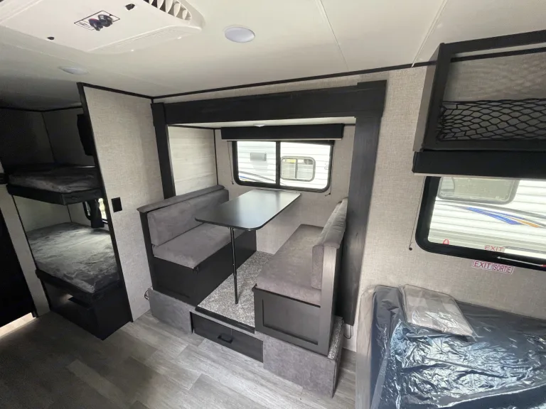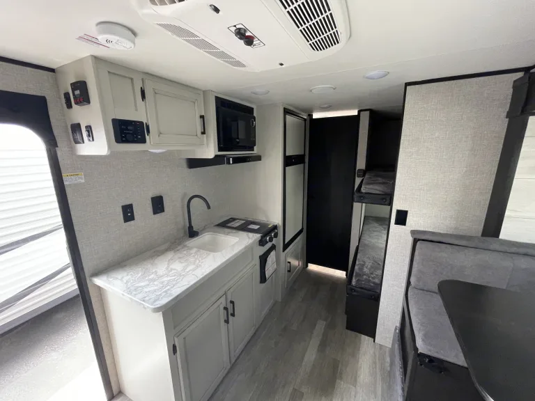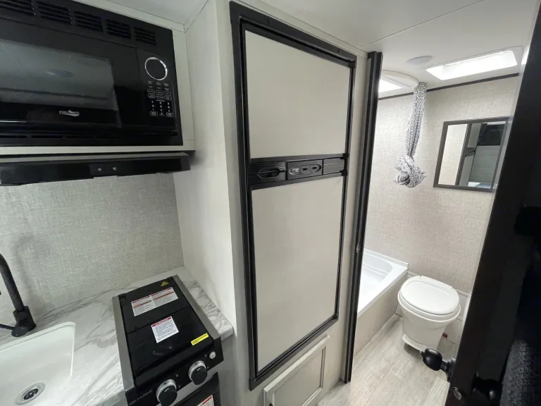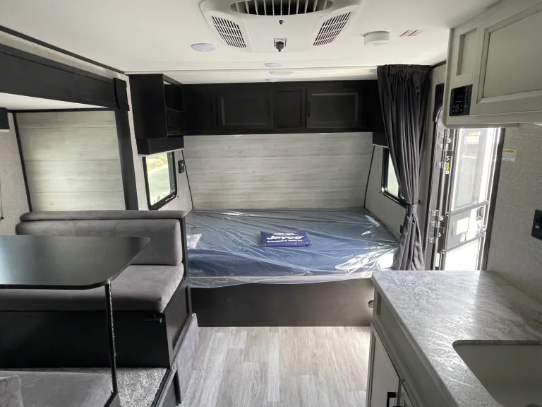 A very popular floorplan for couples and families with small children. Slide adds a bunch of space inside when parked. Solar panels for more consistent dry camping or boondocking. Towable by mid size SUVs.