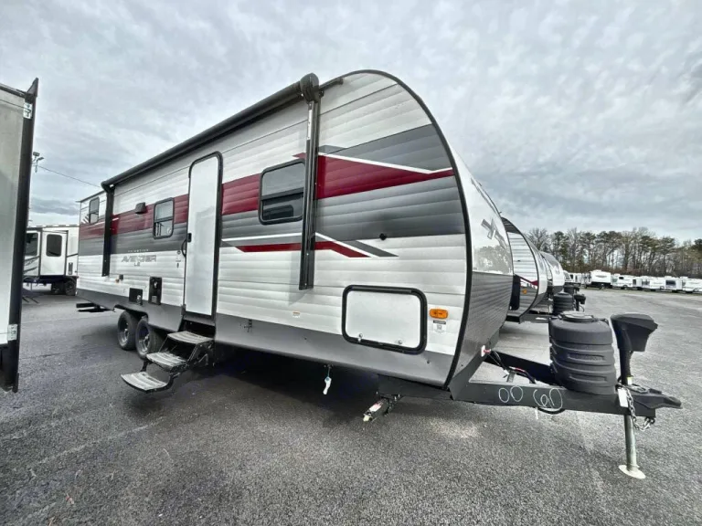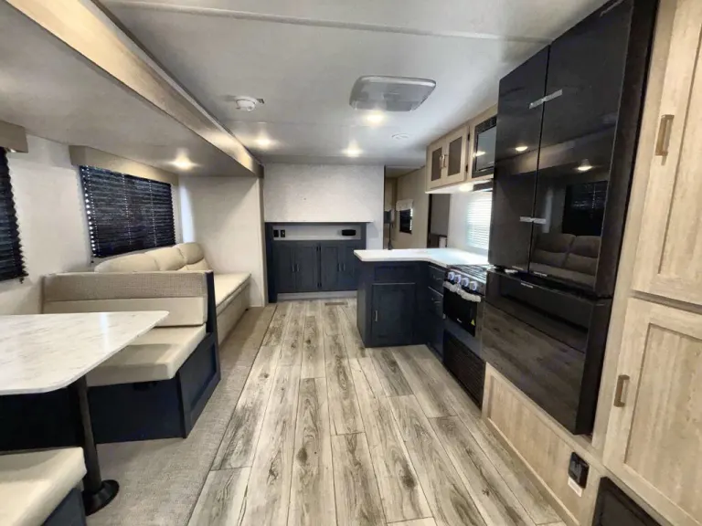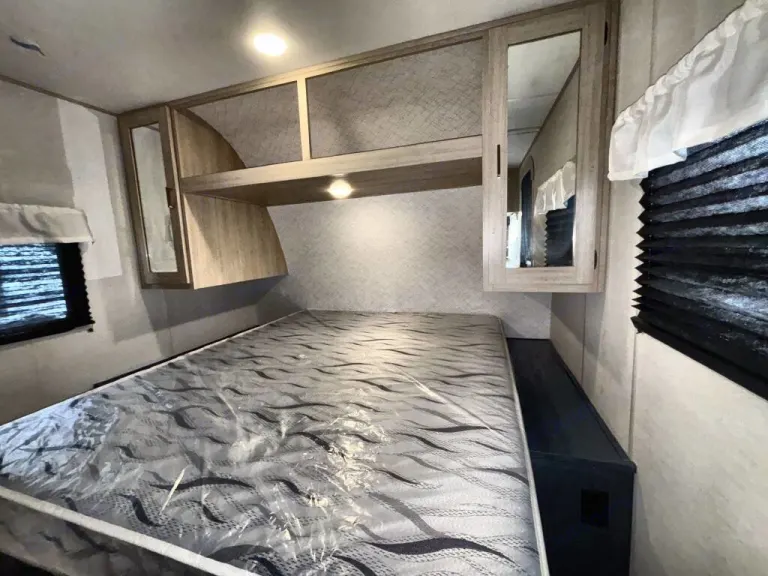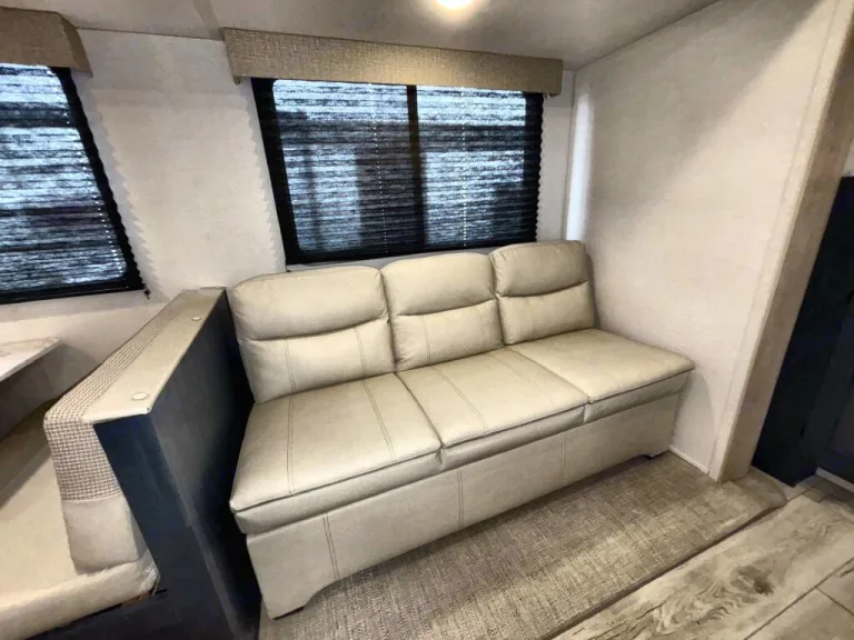 Looking for a trailer that houses everyone? This trailer offers lots of sleeping choices with a set of double-size bunks, a queen bed and furniture that doubles as sleeping space! You will also appreciate the added interior space thanks to the large slide in the living area that features a booth dinette and sofa. Up front, there is a private bedroom where you can retreat to at night away from the bunks in the back, and the bedroom features ample storage with dual wardrobes and an overhead shelf for your things.