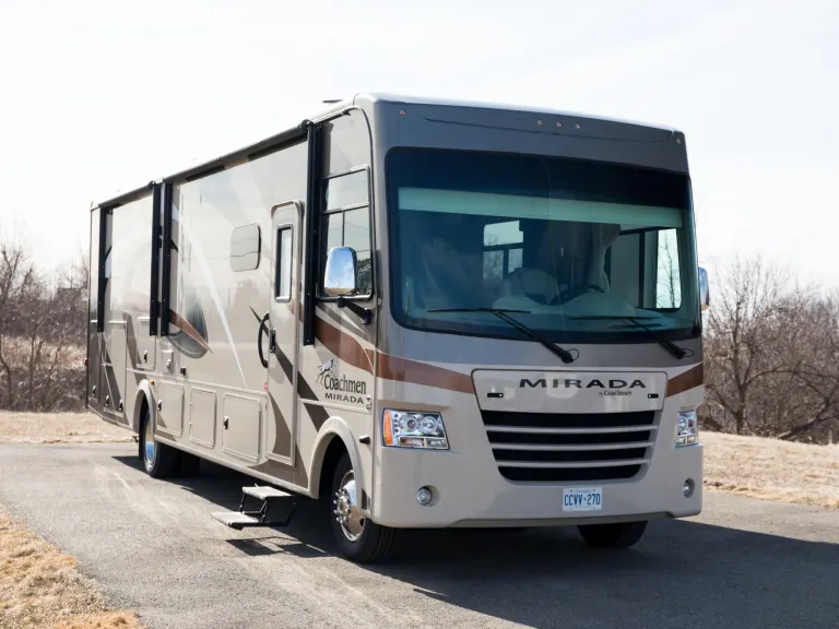 The Mirada Class A "brings more to the road." The Mirada makes RVing in a Class A Motorhome fun and affordable! Why not travel in the comfort and prestige of a Class A Motorhome? We can make your dream adventures possible in the Mirada Class A Motorhome.Whether you are a first time motor home buyer or a seasoned motor home travel connoisseur, the Mirada is designed to please... with a practical and usable floor plan space and great looks that every family can enjoy!You will be proud to own the all new Mirada with a long standard feature list that includes such items as Corian kitchen countertops, Corian sink covers, 30" OTR Microwave, hard wood cabinetry with raised panel inserts, two 13,500 BTU air conditioners, 50 amp service, 32" TV in living room and a bedroom TVs, plus ample pass through exterior storage. Our coach command centre makes it easy to utilize commonly used gauges and switches. Not only will you be impressed but we want to impress your friends and family as well. Options like a fireplace and 40" TV upgrade are available.There are four Mirada models to choose from all using the V10 6.8 litre Triton engine. The Mirada carries 66 gallons of fresh water reserve and can sleep up to eight.*This vehicle has 2 awnings one passenger side and 2 slideouts on the Driver side