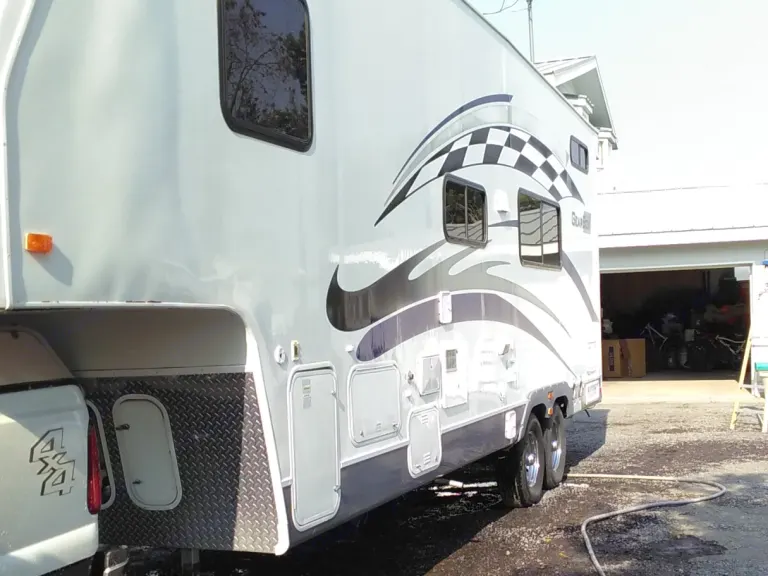 Fully self contained 5th wheel (with gooseneck hitch) Toy Hauler. On board generator, fuel fill up station, air compressor, outdoor shower, awning, air conditioner, lots of overhead storage. 2 queen beds and 3 single beds.