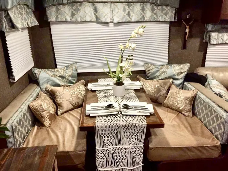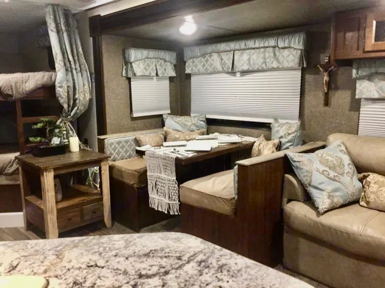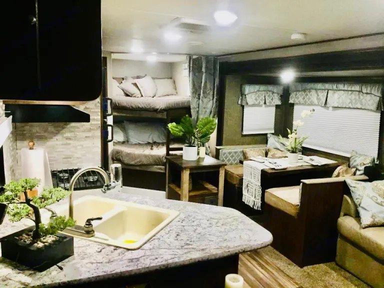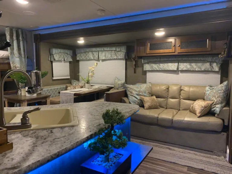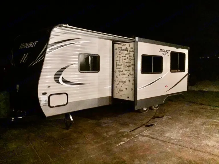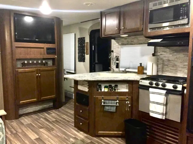 This beautiful travel trailer sleeps 9. Your rental comes with two full 20 Lb. Propane tanks, 1 Full filtered drinking tank, washed and sanitized Bedding and towels. The kitchen includes eight sets of forks, spoons, knives, bowels, plates, cups, mugs, coffee maker with filters, blender, two pans, and cooking utensils. As well as microwave, three range stoves, oven, 2 TVs, A/C and Heater. If the delivery package requested the travel trailer will be leveled and connected to power, water, and sewer is available at the campsite. If the travel trailer is picked up at its location, the sway-controlled system installation will be included. Towing vehicle must be able to tow at least 10,000 lbs. A fantastic extra is that the trailer has an external shower great for beach or lake site camping.