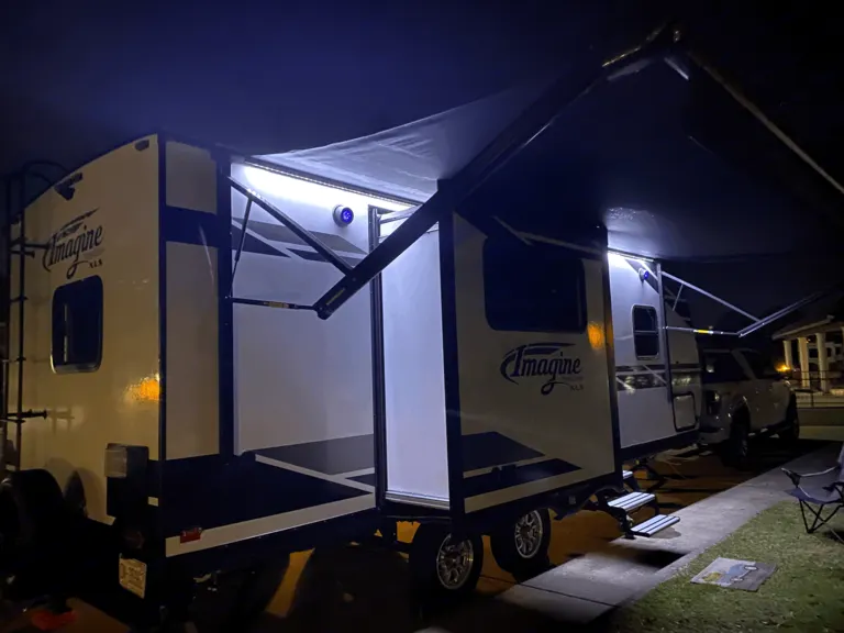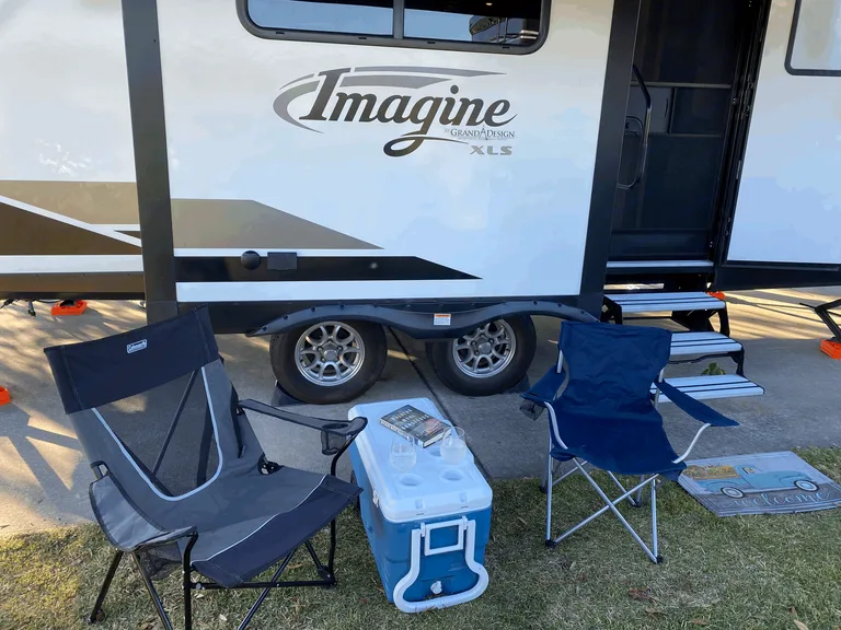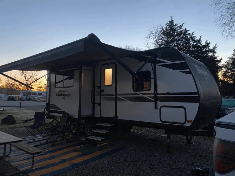 This is a 2020 Imagine 22RBE by Grand Design. You will sleep well in the comfy queen bed with gel topper. This unit features a desirable removable swivel dining table that attaches to the 2 person recliner couch that also has heat and massage settings built in. It has a heated and enclosed underbelly, power tongue jack, bluetooth stereo, antenna tv, cable hook up, hookup for outdoor tv (tv not supplied) and usb charging at the bedside. The kitchen features a three burner cook-top, oven (pizza size), refrigerator/freezer, microwave, overhead cabinets, lower drawers, and plenty of counter space, plus a single deep kitchen sink. The bathroom has plenty of counter space and a standup shower. Spray off after play with the outdoor faucet that has hot and cold water. It is great for a couple and perhaps a small child on the couch. Beautiful lights inside and out, electric awning and 1 power slide-out for the couch. My wife and I use this with our Golden Retriever Gus and it serves us comfortably. It is a 30 Amp unit, please book your site accordingly. No boondocking (dry camping) please. This is only available by delivery. We hope you enjoy this camper as much as we have so far!