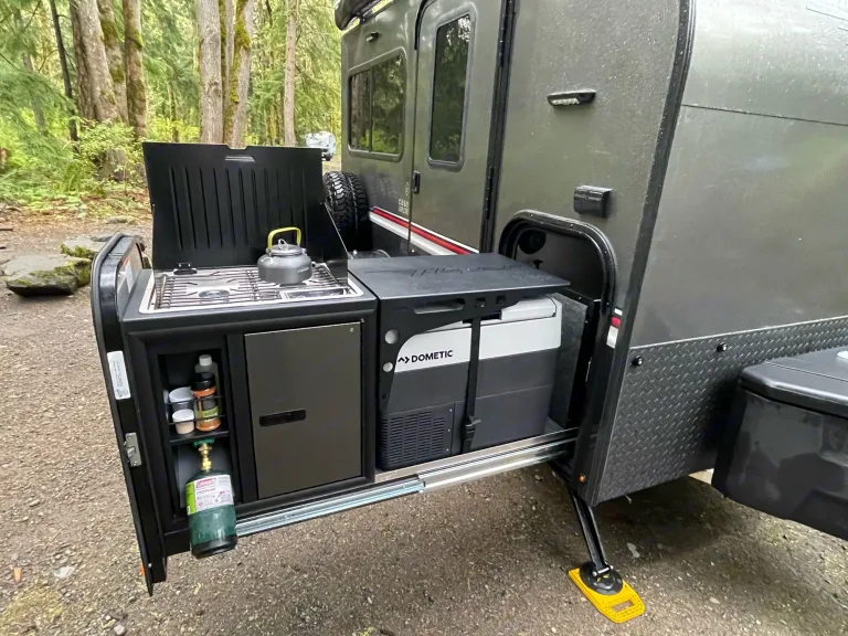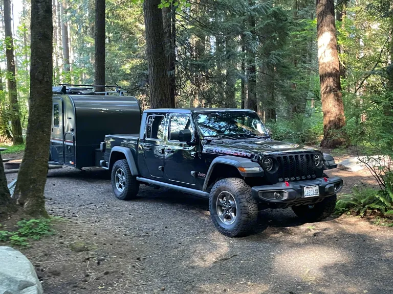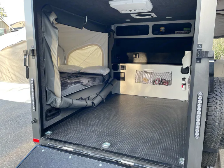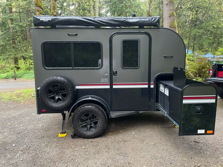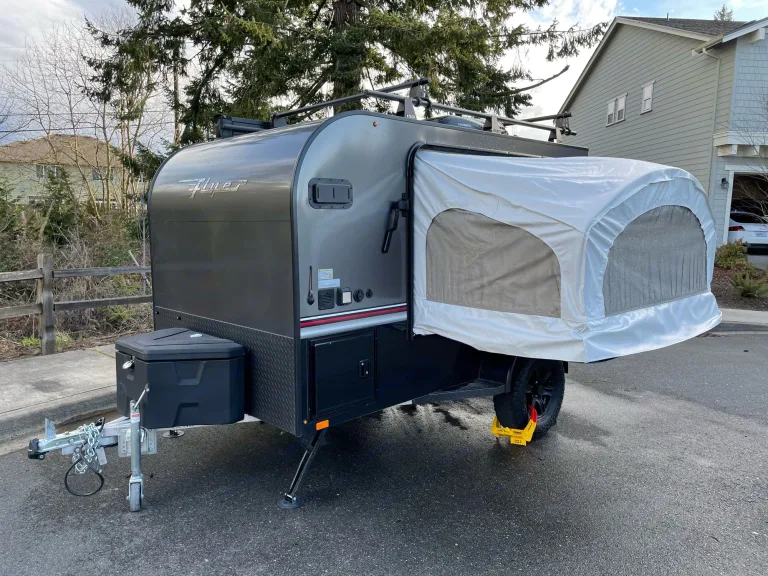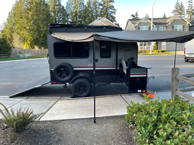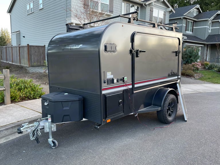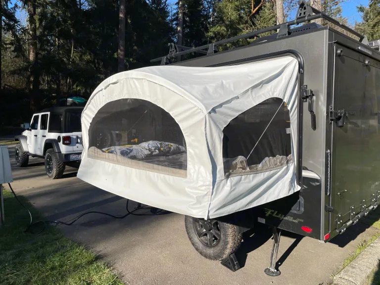A little trailer that can. 2021 Intech Flyer Explore with tip out bed, roof top AC/heater, off-road tires, 2" lift, pull out kitchen and 270 awning. You can tow this trailer with mid size SUV.What's includedMattress cover, basic utensils for two, paper towels, first aid kit, 1 pound propane, solar panel, 7 gallons water container, 2 camping chairs and a foldable table.Other things to noteRenter tow vehicle must be equipped with break controller and 2" ball that is 17" off the ground. Break controller and hitch ball can be rent if needed with advance notice.