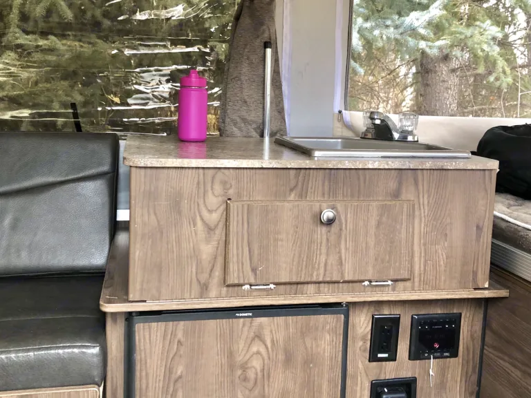Equipped with a propane heater, refrigerator, working sink plumbed with a drinking water filter purifier, upgraded quick -connect 3-Burner stove for exterior or interior use, Power Ceiling Fan Vent, lots of drawers, cabinets and extra storage, on-board 20 Gallon water tank, and 2x Propane Tanks providing 40Lbs of fuel for long trips, and an outdoor pressure washer hose great for doing dishes and spraying off bodies and gear.