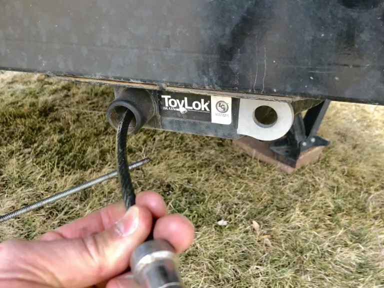 ToyLok 15' Pull-Out Cable System - used with a padlock for Bikes, Coolers, Kayaks etc. Distinctive fender flares and Off-Road Mud Rover Radial Tires with Aluminum Wheels that provide 12” ground clearance to go anywhere. Includes a full-size spare. Equipped with 4 Heavy-Duty Leveling Stabilizer Scissor Jacks.