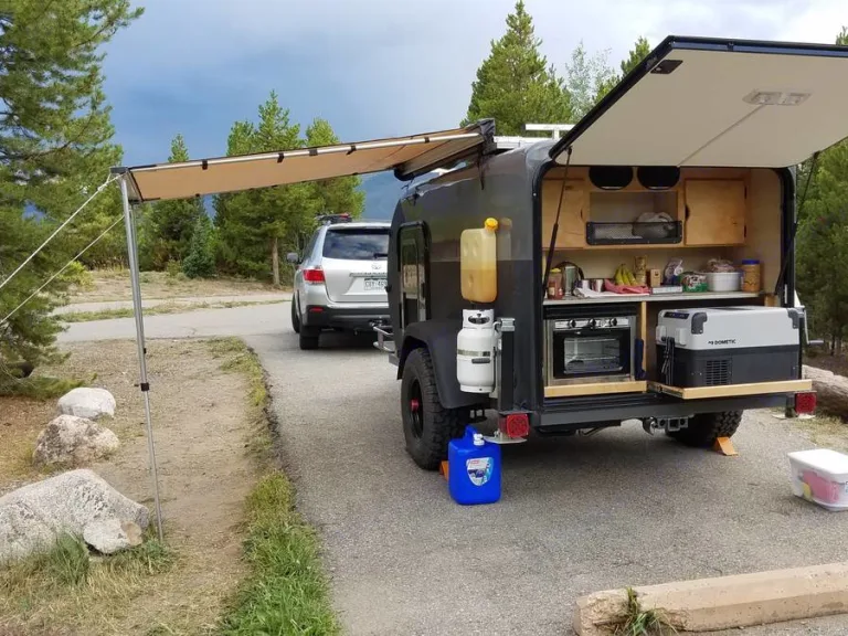 Bad ass trailer on the outside; cozy bedroom on the inside! This High Altitude Trailer, built in Sedalia is the ultimate option for camping in Colorado and the surrounding mountains. With a roof top tent, huge off-road tires, integrated solar panels, battery, oven/range, and Dometic fridge, you can take your family pretty much anywhere in this trailer, while still eating great meals and getting a solid night of sleep.On the front, the trailer has a built in rack and toolbox. In true teardrop fashion, the back flips up to show your kitchen. It includes a built in fridge that runs off the battery/solar, range, mini oven, and cupboards for gear. The hitch off the back fits a bike rack.For sleeping, the interior of the trailer includes a queen, memory foam mattress. Up top, you can sleep 2 more people (or 3 if kids) in the roof tent with built-in mattress.We have loved taking our two little boys camping in this teardrop, as it's rugged enough to feel like we're still camping, while at the same time simplifying the packing and providing a cozy spot to curl up.Important information: