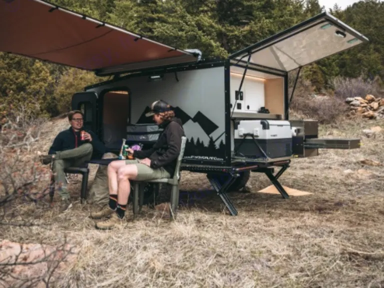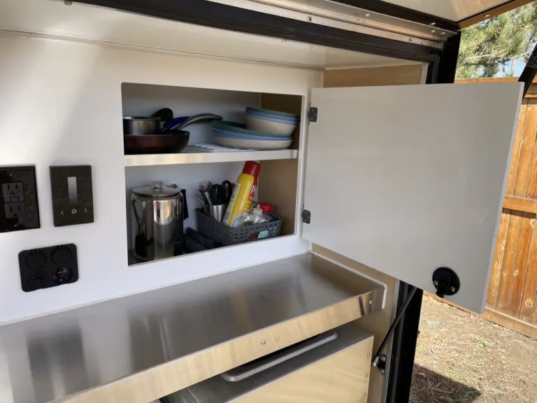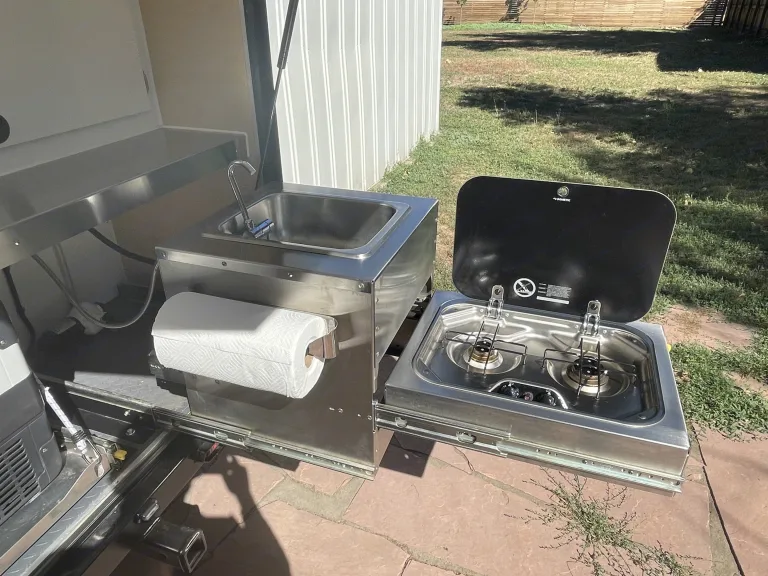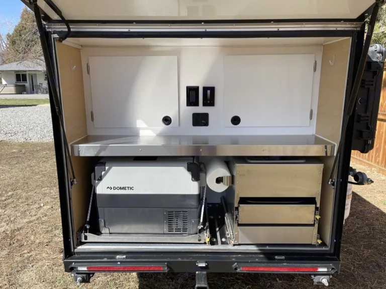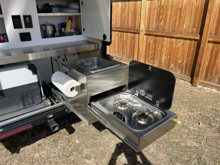 sleeping for two with a memory foam mattress for Extra comfort.Additionally it has a fully loaded galley kitchen. The galley kitchen comes fully equipped with a 12v fridge/freezer, sink, and two burner stove. The solar kit will keep the battery topped off during extended off grid adventures. Bring all your gear and accessories with ample storage in the cabin and kitchen cabinets.
