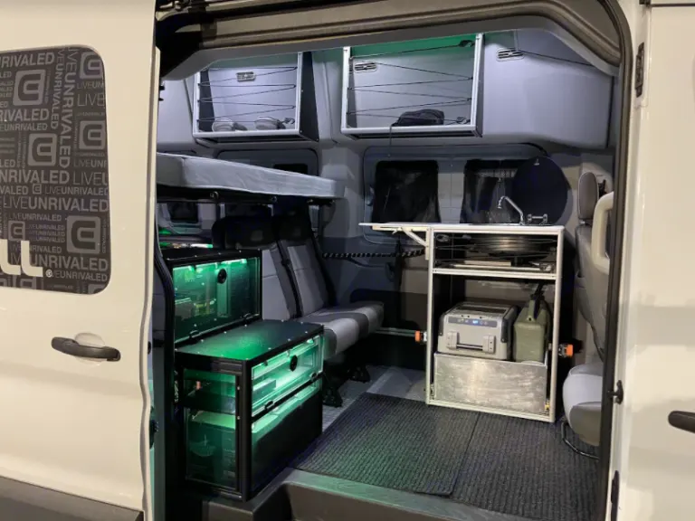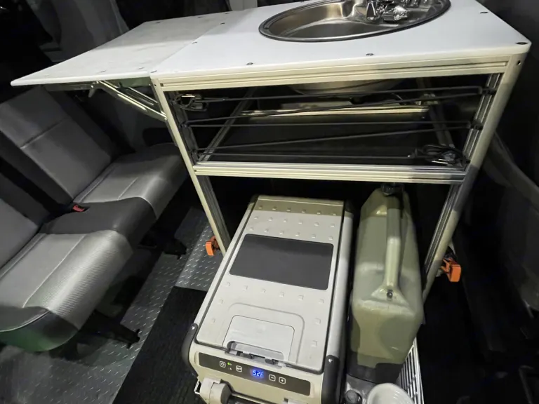 Our revamped Ford Transit High Roof van was fully built out by a professional company, Van Do It. The van features a custom, professional conversion fully equipped with a queen-size bed that is adjustable up and down. In addition, underneath the bed is a heavy duty sliding cargo platform great for storage, or that can double as a second sleeping area (with a twin size inflatable mattress provided upon request). The van also features a removable kitchen pod with sink, a solar powered hot water heater and pump, an external shower and privacy screen, and a solar powered 32'' LED smart TV with a DVD player!This rig is also jam-packed with high-end components - its custom modular design can seat up to 7 people with seatbelts, with 3 seats removable to make space for a kitchen pod or additional storage. It has an A/C, portable generator and external plug to power the AC, a solar powered portable refrigerator/ freezer, as well as optional bike fork mounts in the rear storage area to allow you to enjoy the outdoors as much as we do.With a 3.5L EcoBoost V6 Engine and a set of brand new Toyo All Terrain tires, this van is a dream to drive and a perfect fit for your ultimate roadtrip.Located 15 mins from the Salt Lake City airport, you can easily travel to many of North America's most beautiful National Parks and/or the Wasatch Mountains within 1 - 4 hours.What's includedWe provide bedding for 2 people (with an option to add another twin size inflatable mattress on the bottom of the bunk bed in the storage area), cooking and dining utensils, 2 camp chairs, a full water tank, and a 2-burner Coleman Gas Camping Stove (propane cylinders not included). Privacy and insulation screens provided for all windows.