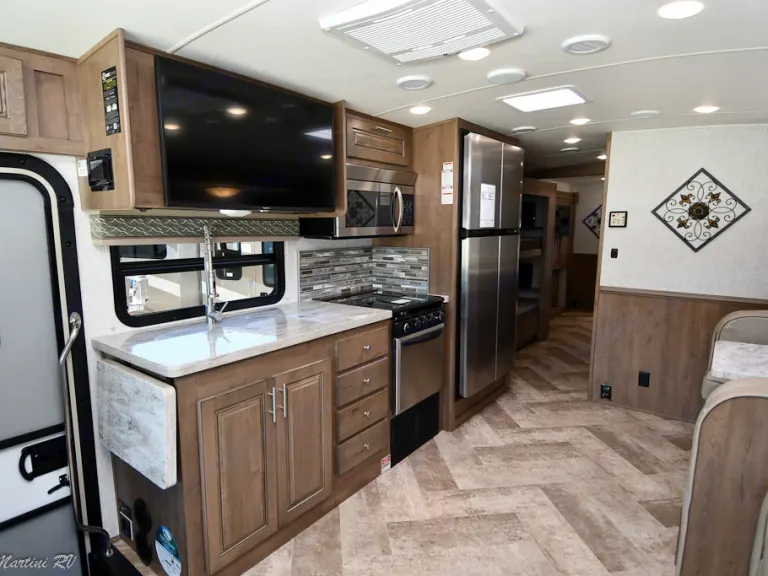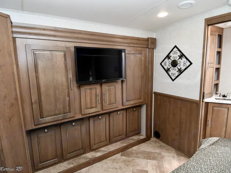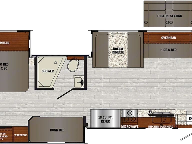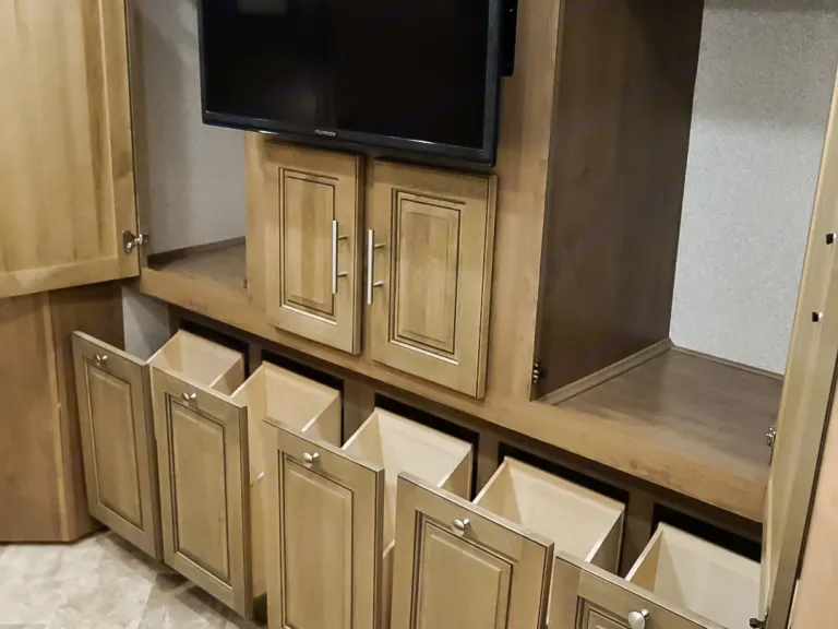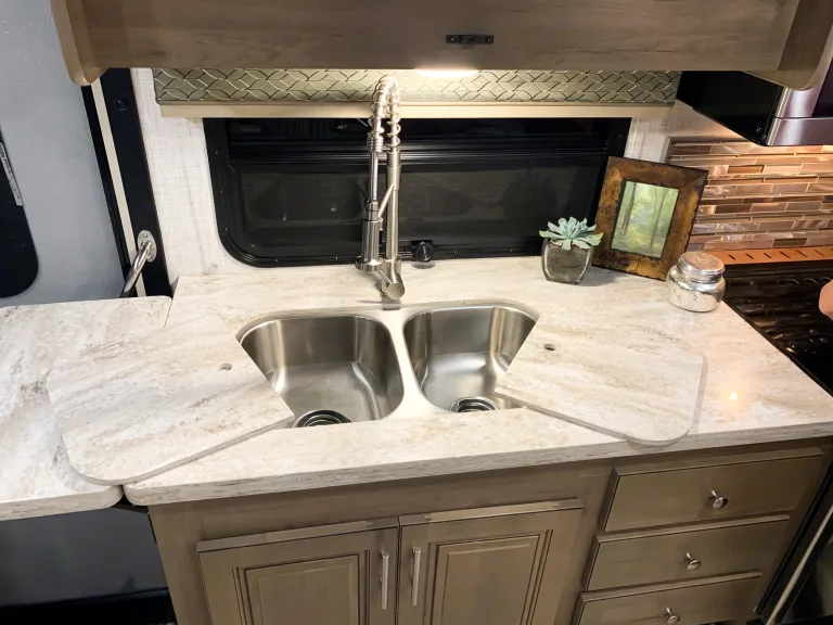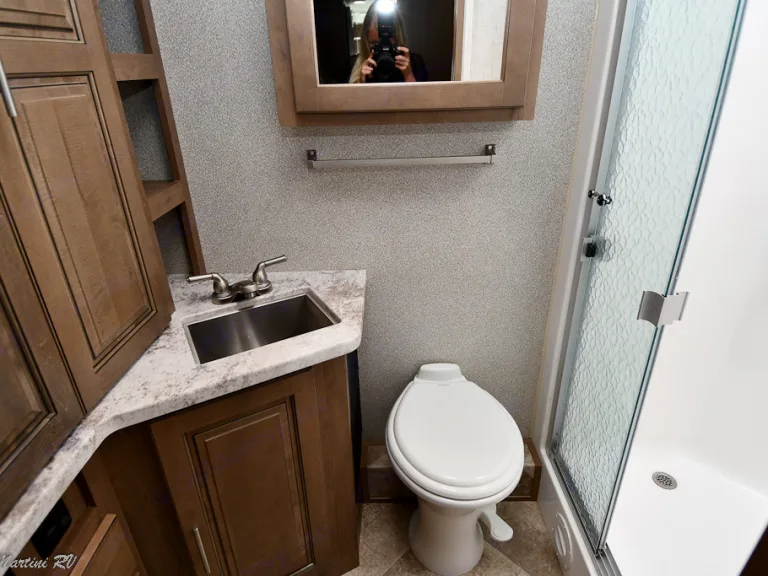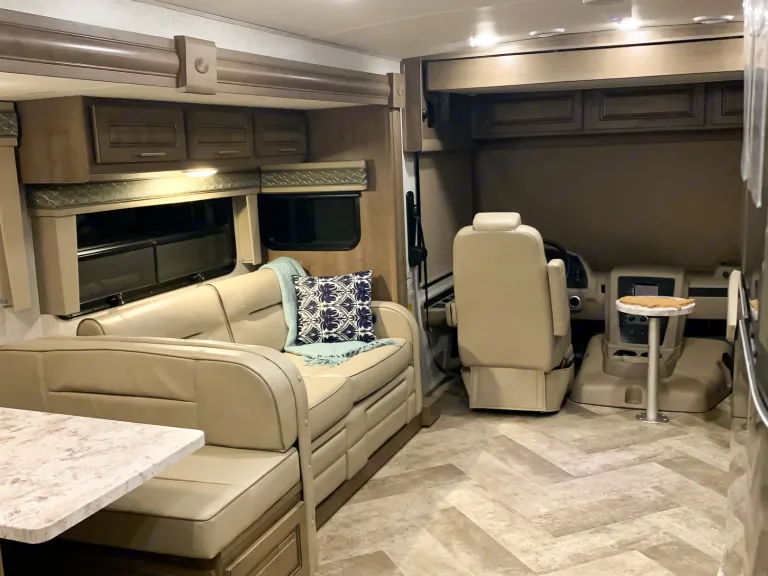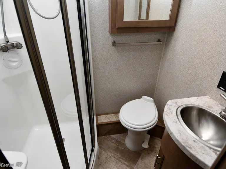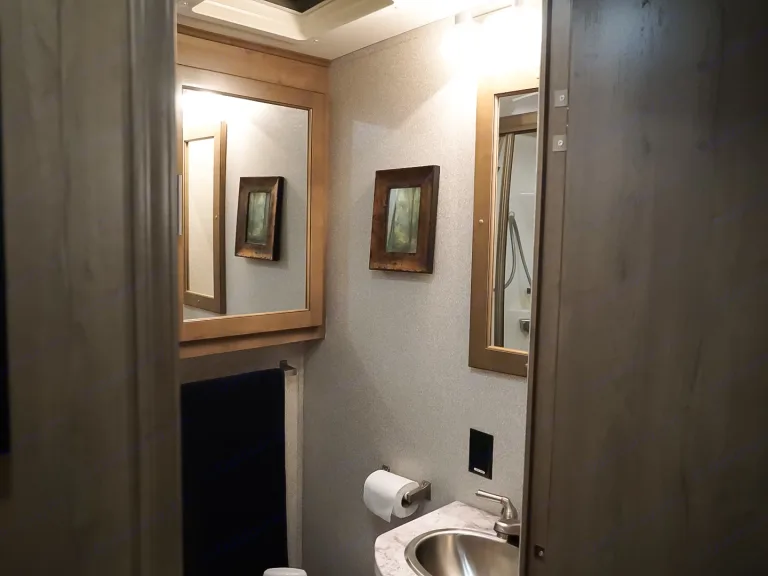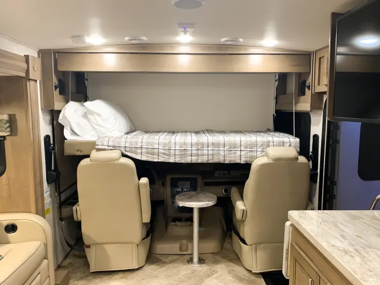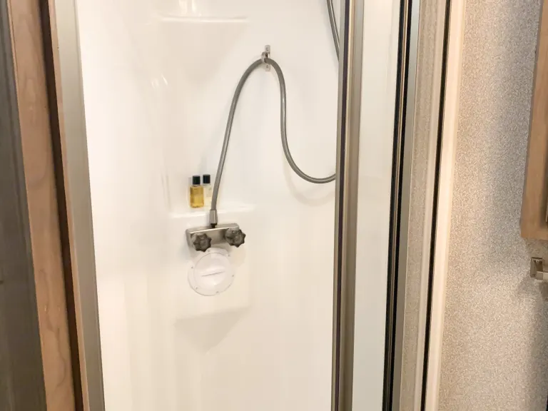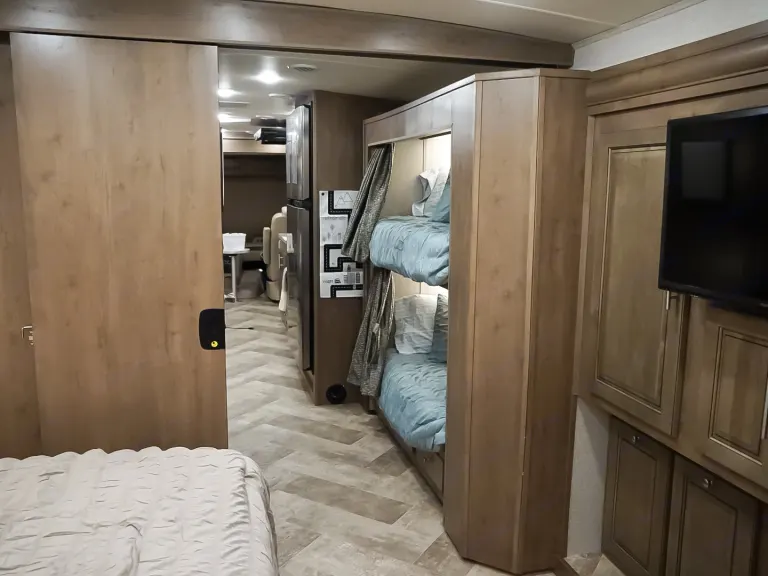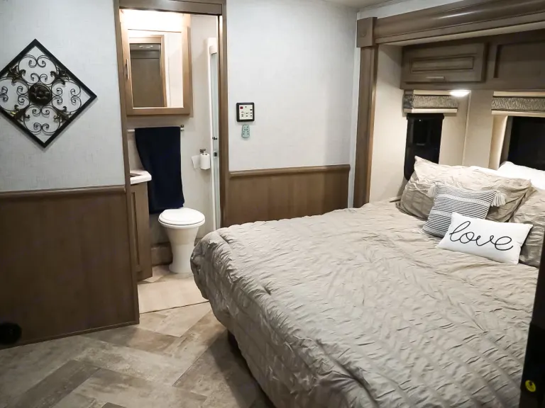 Enzo is super spacious. There is a master suite with a king bed and it’s own bathroom with a shower. (So yes there is two bathrooms and two showers inside the motorhome with an additional small shower outside) One of the reasons we choose this particular model was how big these showers are. This makes a huge difference if you have young kids that need help in the shower.